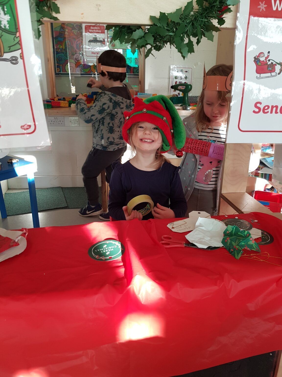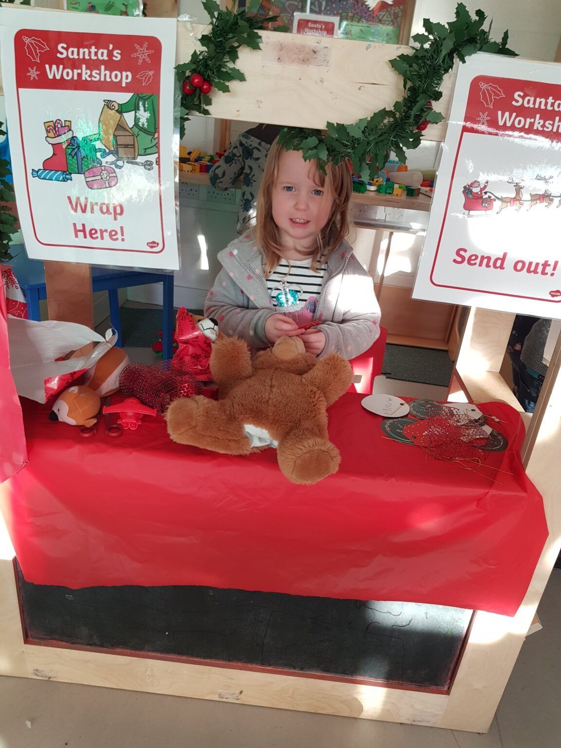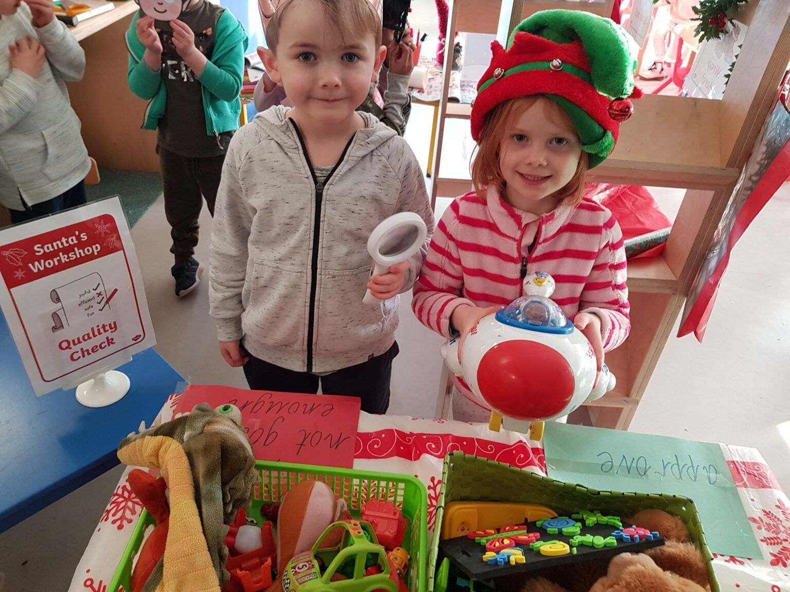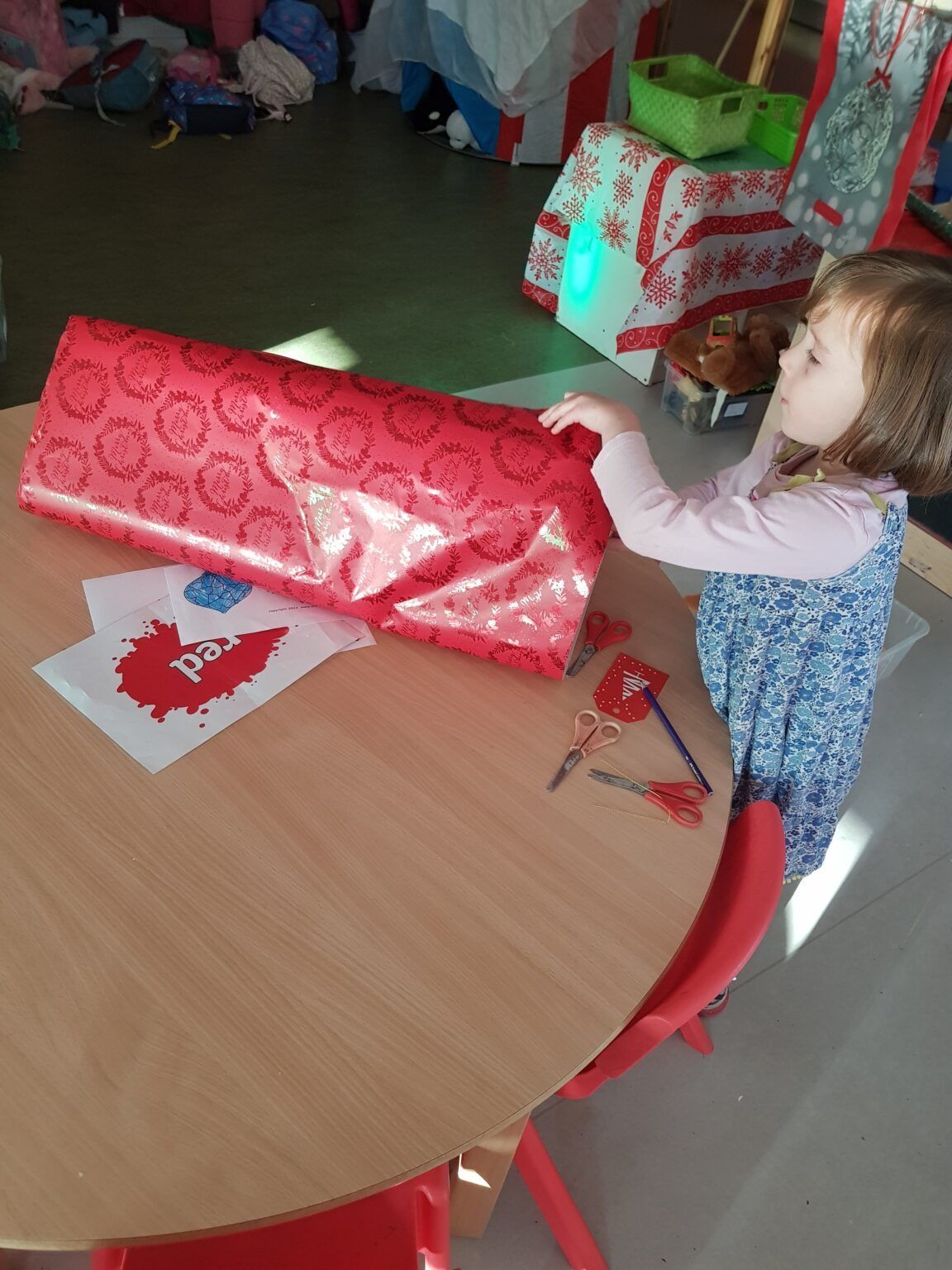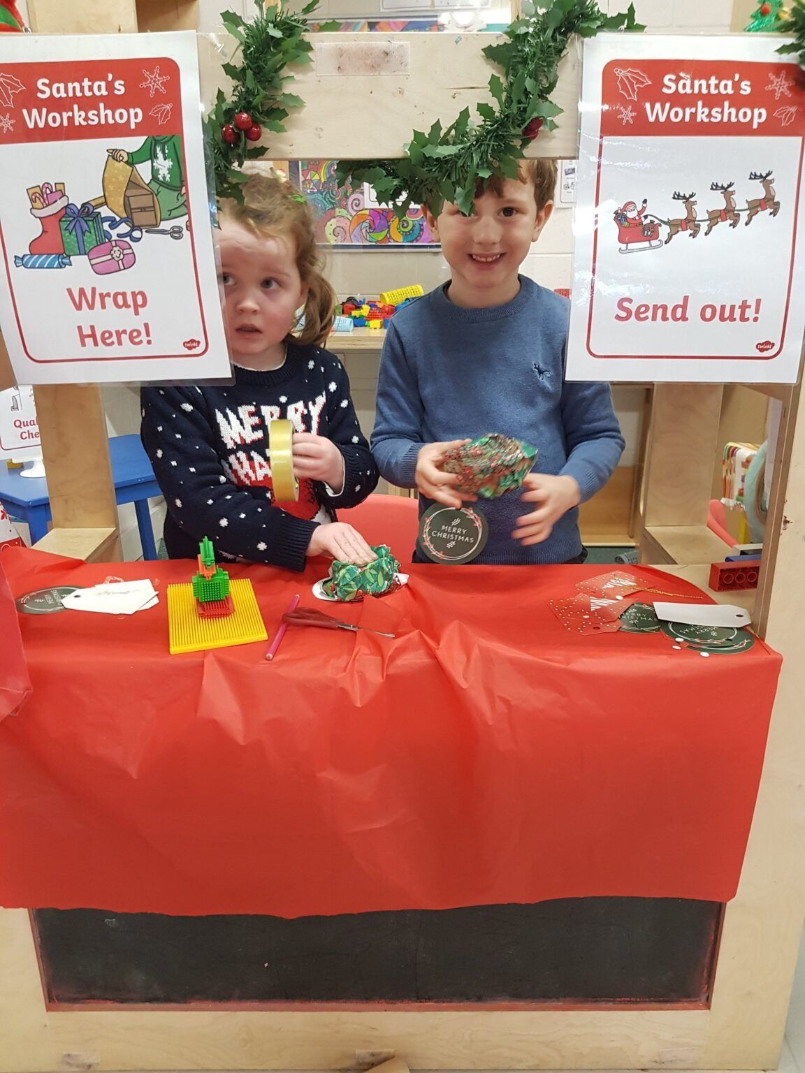 In Santa’s Workshop children planned their play to decide which station they would go to – first we designed our toys using catalogues & pictures as inspiration,. Next we assembled the toys as busy elves in the workshop. Then we had to sort through toys to decide if they were up to scratch by doing doing our quality check! Finally, we wrapped the toys to send out to children all over the world & put them in Santa’s sack ready to go!