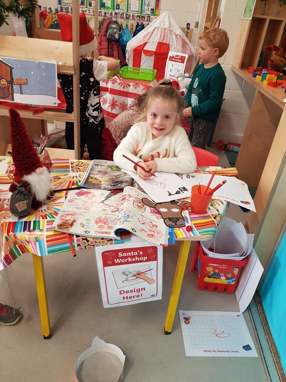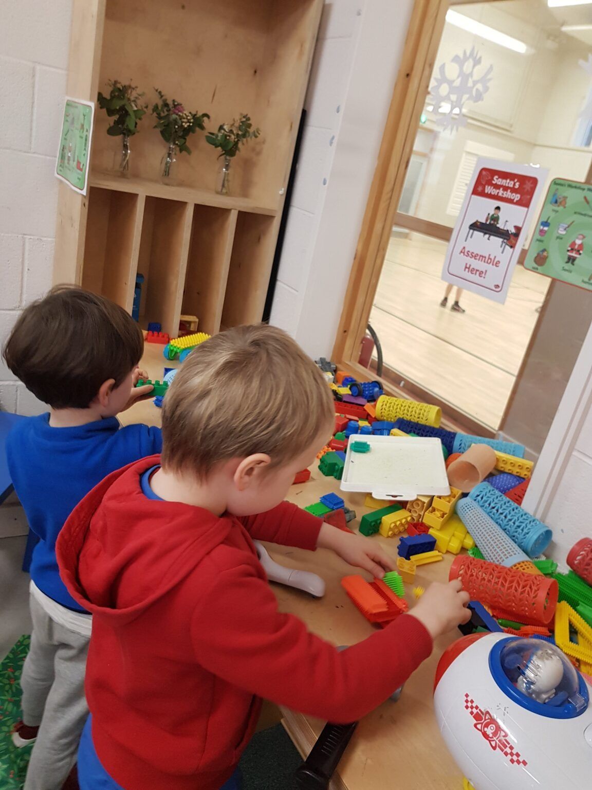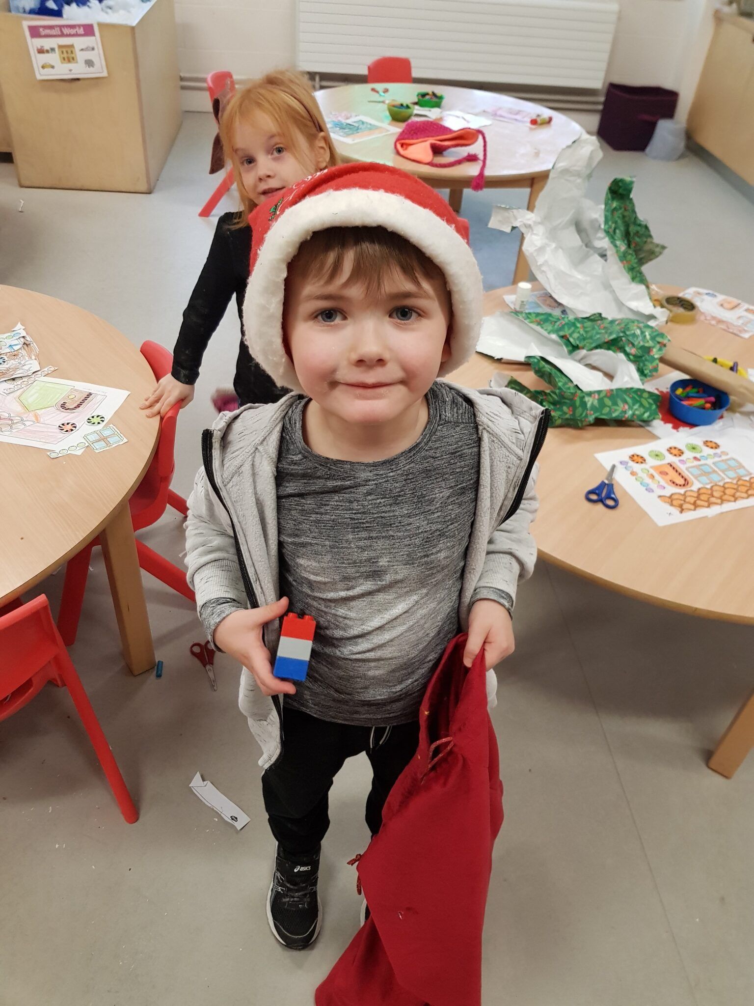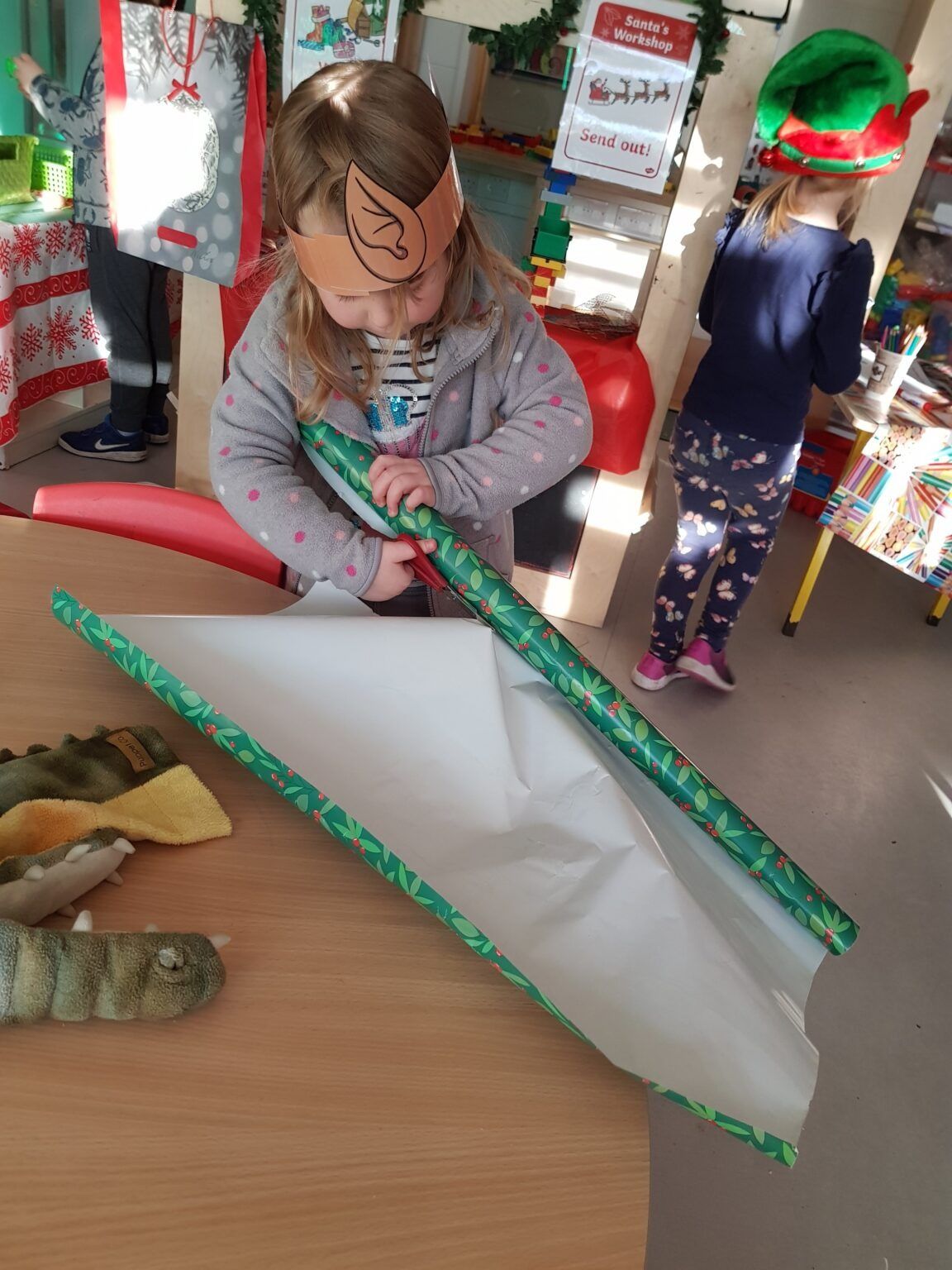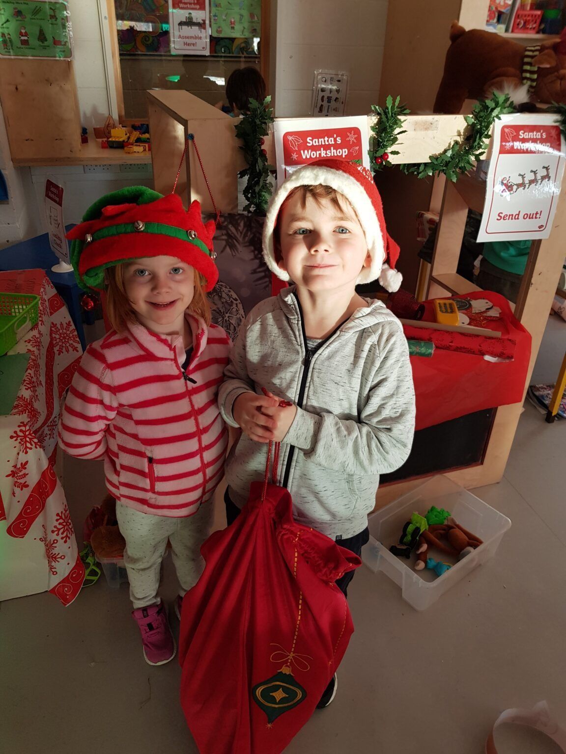 In Santa’s Workshop children planned their play to decide which station they would go to – first we designed our toys using catalogues & pictures as inspiration,. Next we assembled the toys as busy elves in the workshop. Then we had to sort through toys to decide if they were up to scratch by doing doing our quality check! Finally, we wrapped the toys to send out to children all over the world & put them in Santa’s sack ready to go!