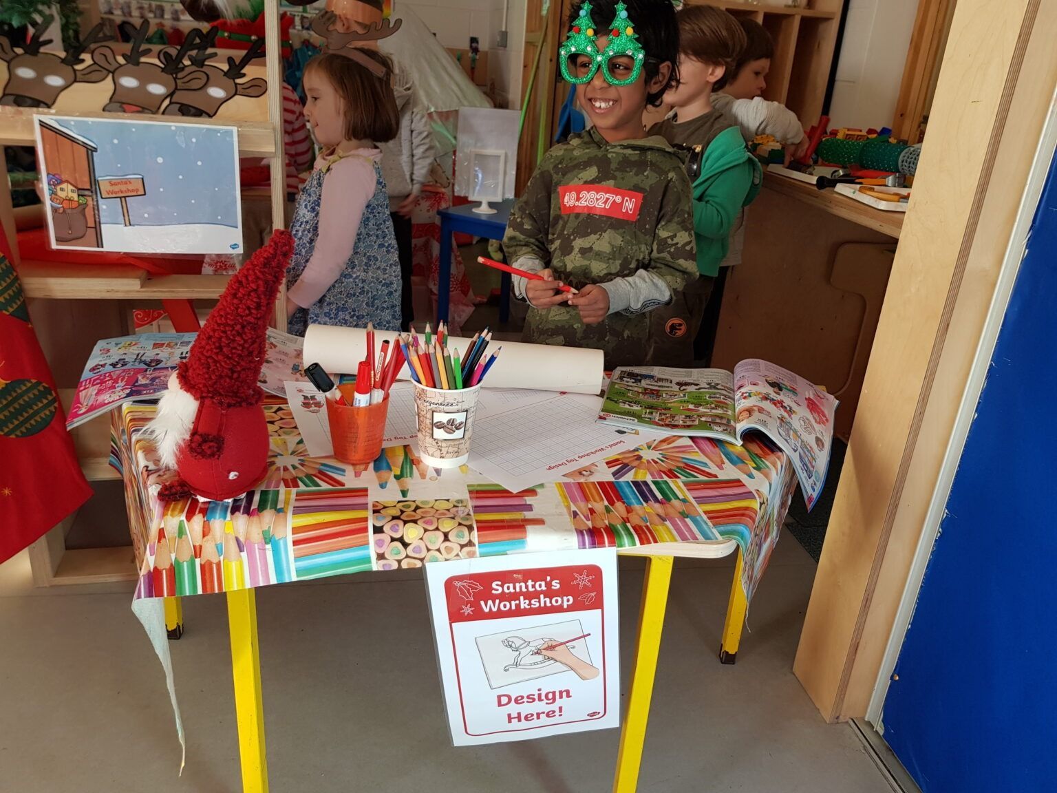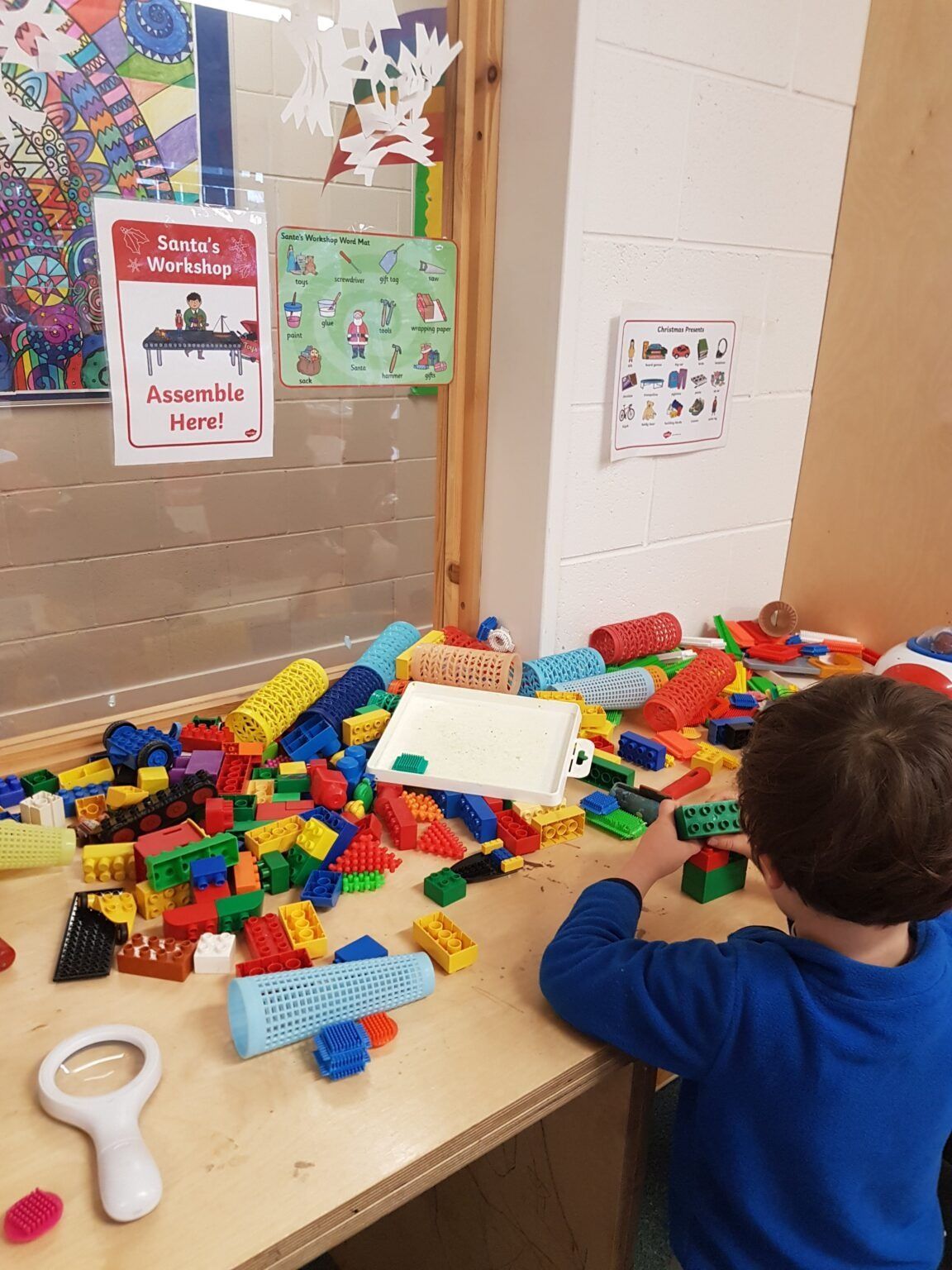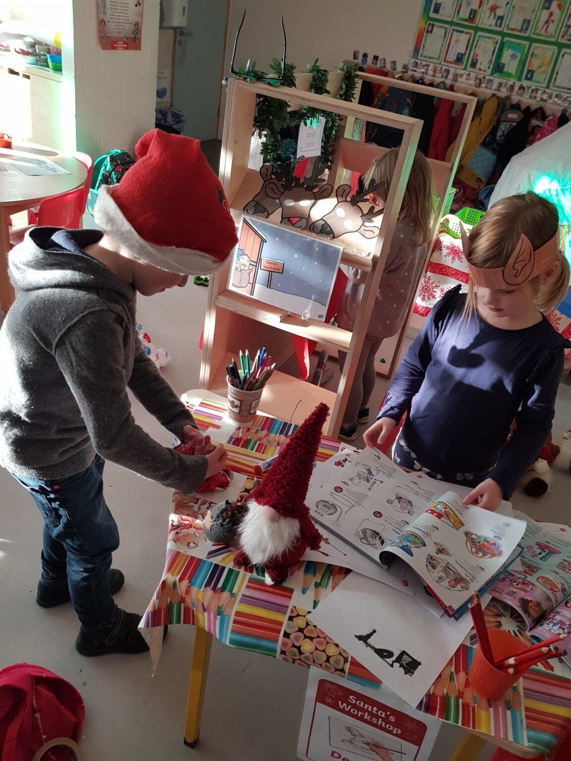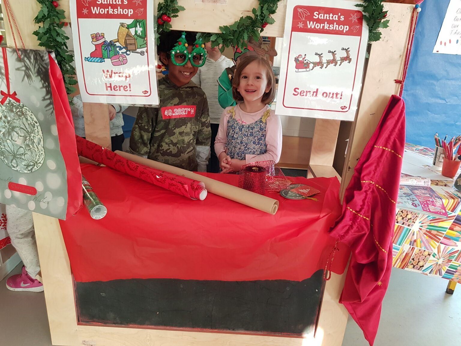 In Santa’s Workshop children planned their play to decide which station they would go to – first we designed our toys using catalogues & pictures as inspiration,. Next we assembled the toys as busy elves in the workshop. Then we had to sort through toys to decide if they were up to scratch by doing doing our quality check! Finally, we wrapped the toys to send out to children all over the world & put them in Santa’s sack ready to go!