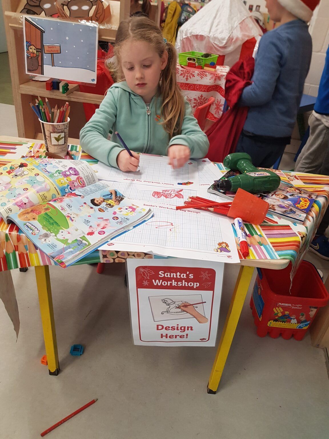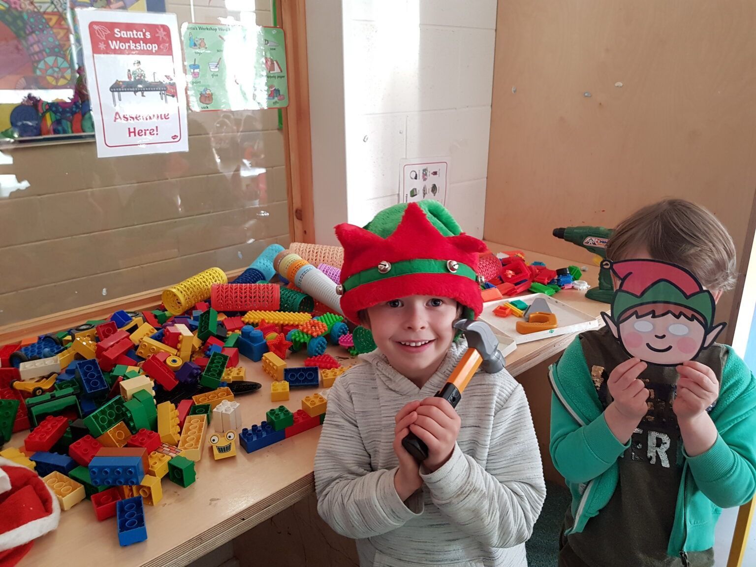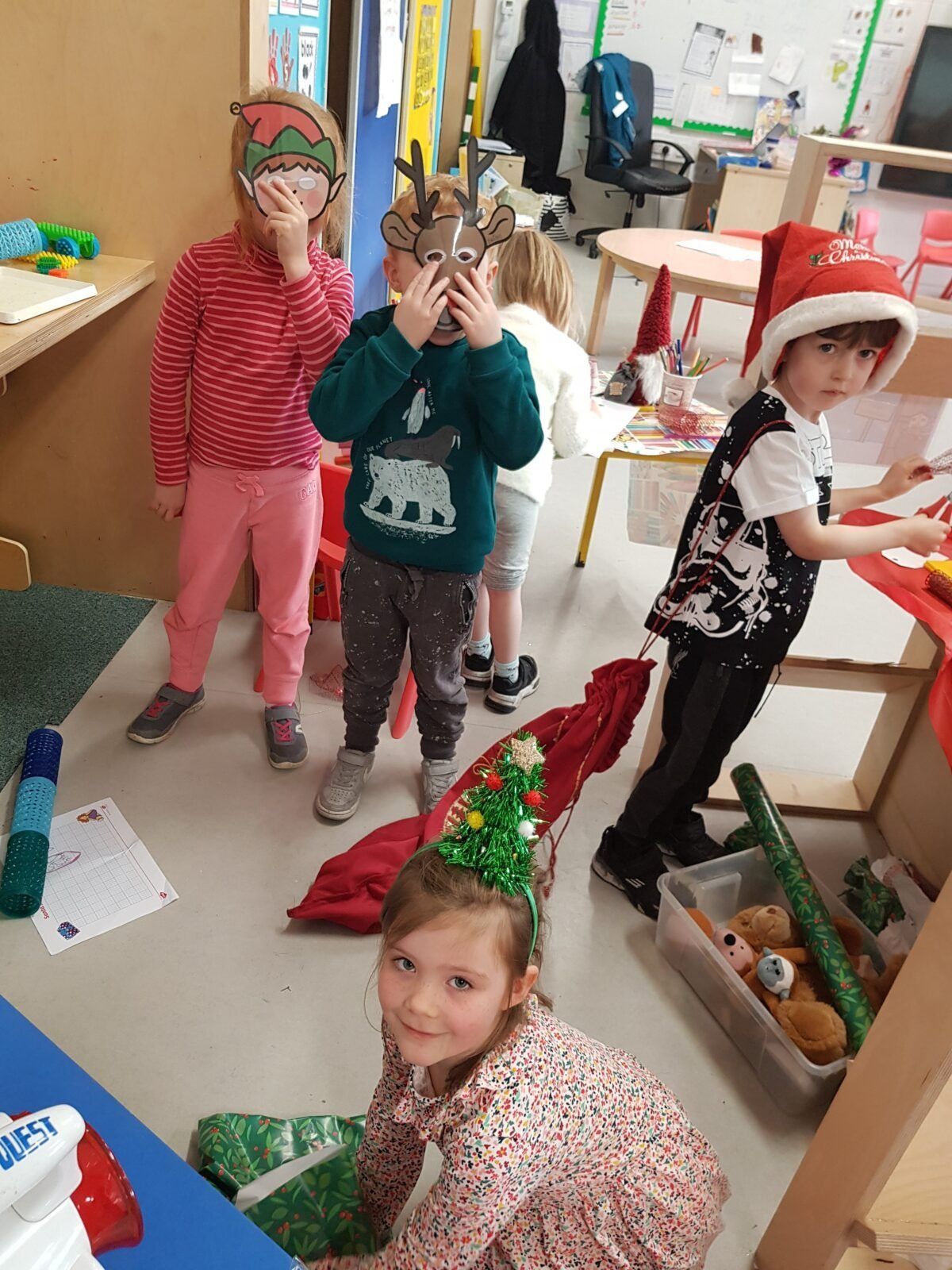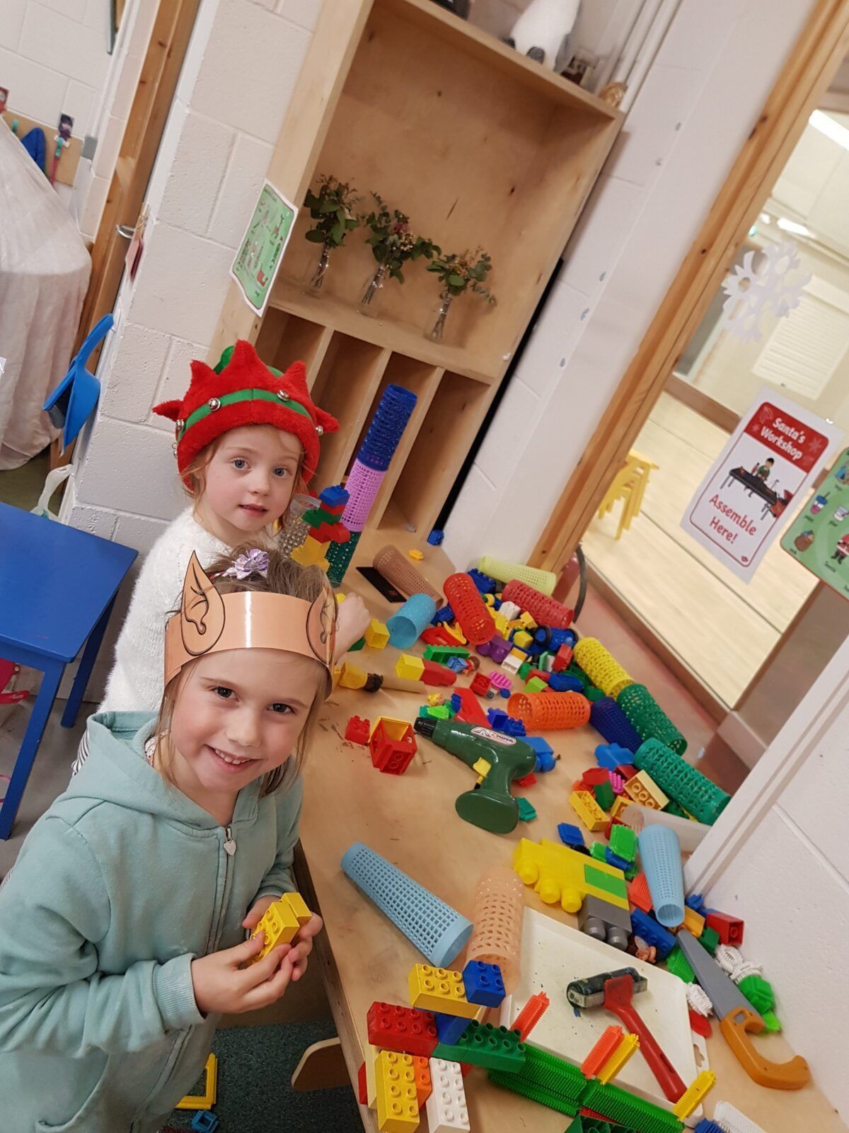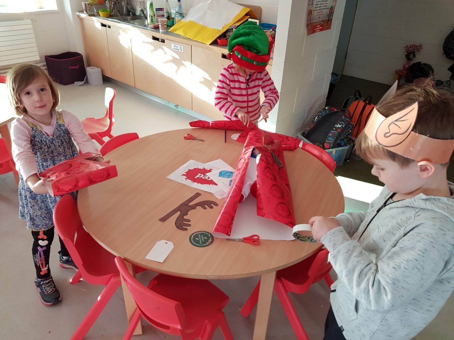 In Santa’s Workshop children planned their play to decide which station they would go to – first we designed our toys using catalogues & pictures as inspiration,. Next we assembled the toys as busy elves in the workshop. Then we had to sort through toys to decide if they were up to scratch by doing doing our quality check! Finally, we wrapped the toys to send out to children all over the world & put them in Santa’s sack ready to go!