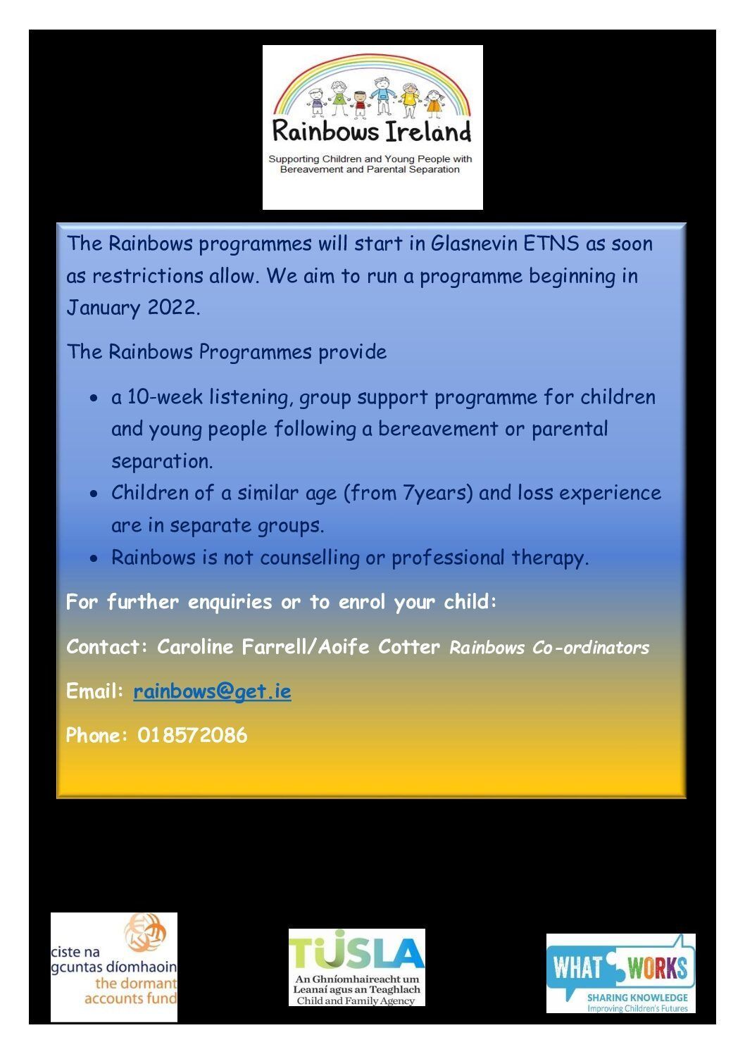 Dear Parents and Guardians/A Thuismitheoirí agus a Chaomhnóirí, Welcome back pupils, staff and parents. We are delighted to welcome some new members on board, Niamh in 5 th class, Aisling K in 4 th class, David C in 2 nd class, Grace in 1 st class and also Justine. Sadly, Danielle has left our team but is remaining within the Educate Together movement. We are hugely grateful for her immense contribution over the last 5 years and wish her, Paul and all of the team in SKY ETNS (Sallynoggin Killiney ETNS) the very best of luck with their new school opening today.