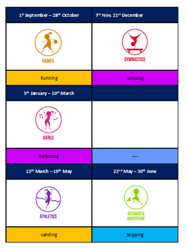 The PE curriculum provides a balanced range of activities for children through the six strands: