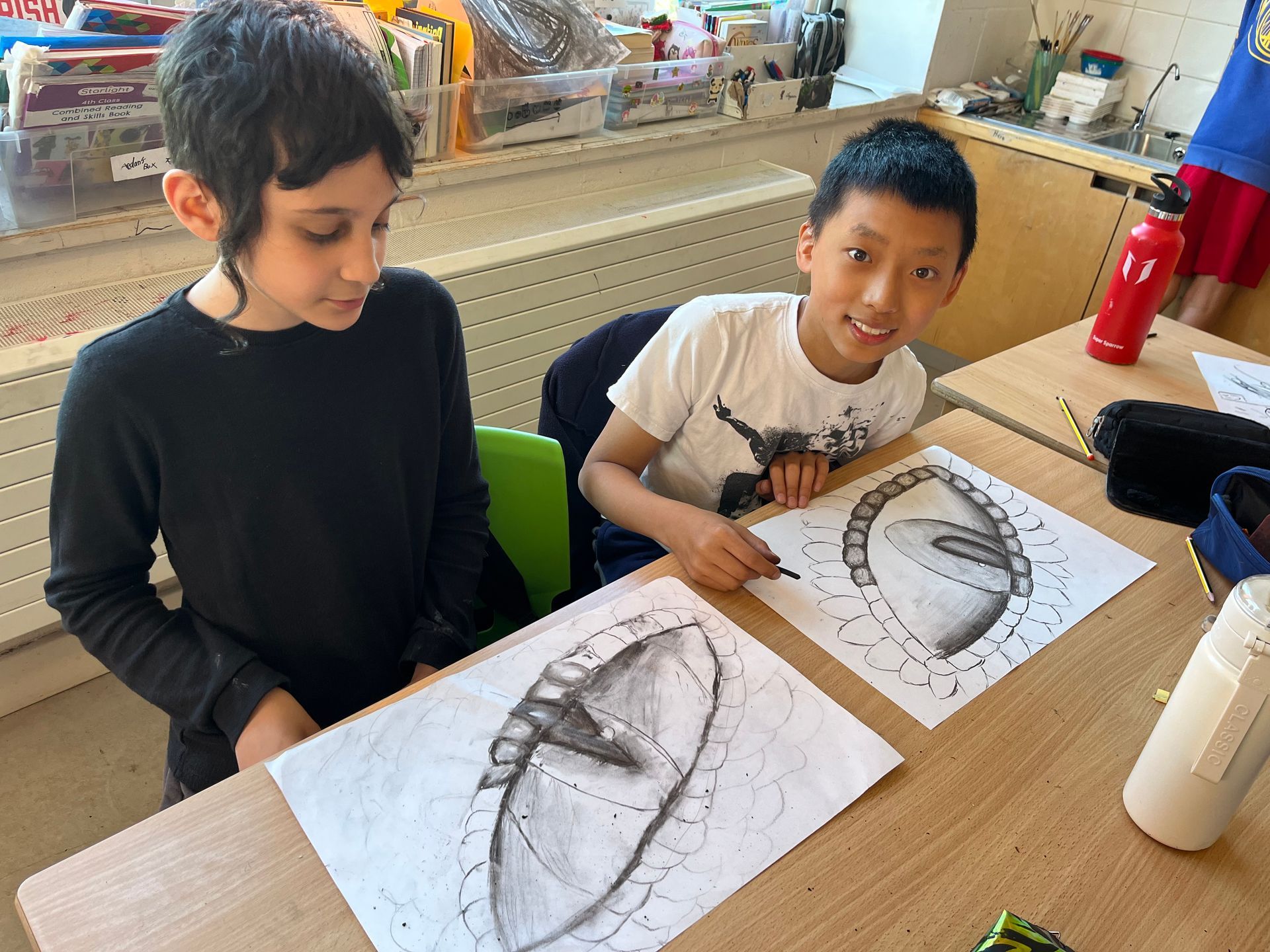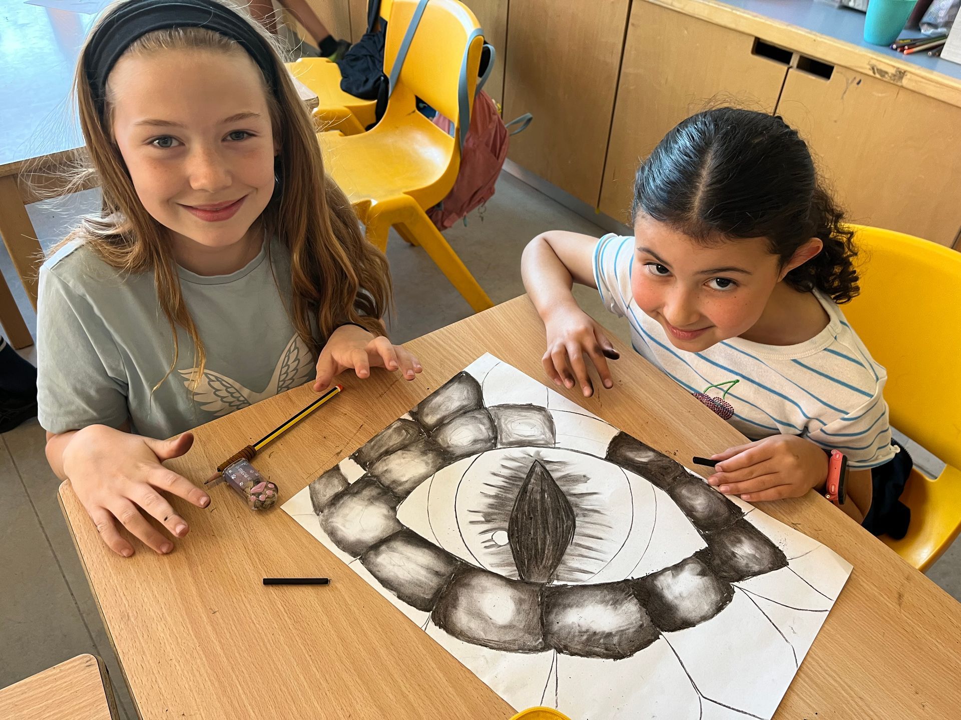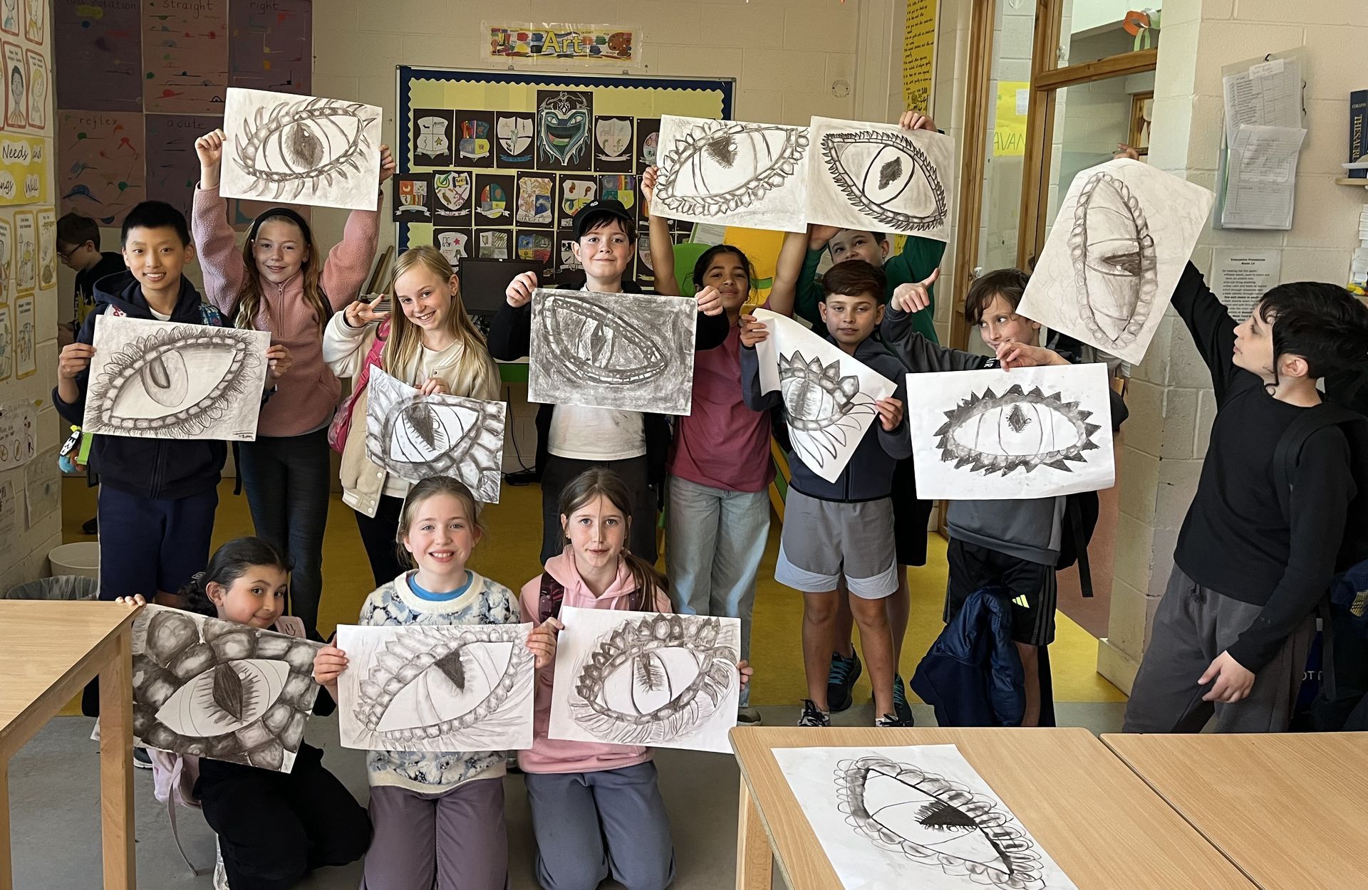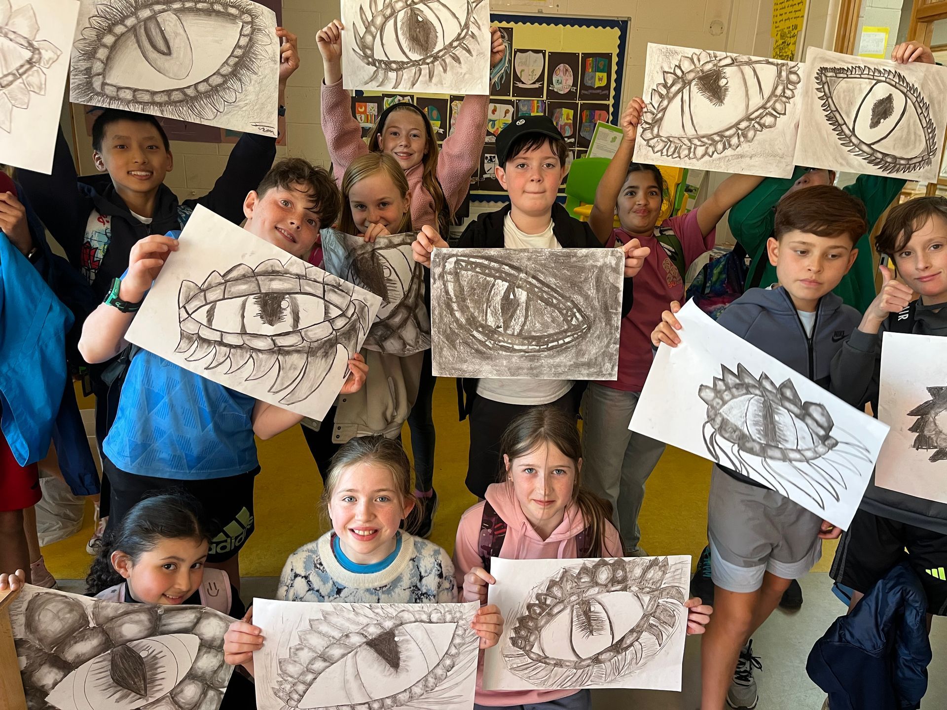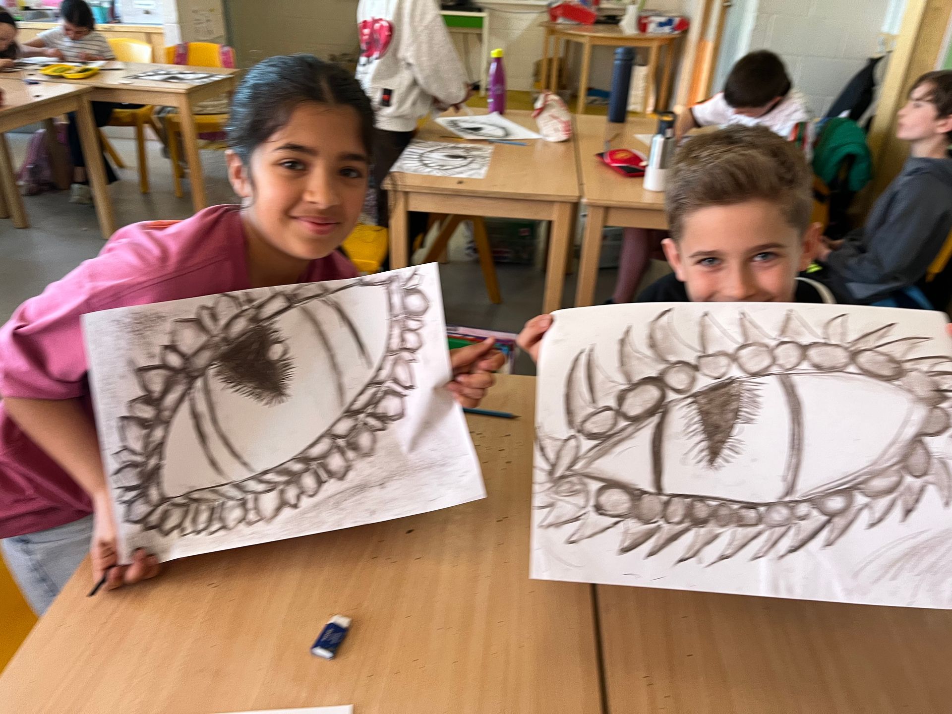 Naomi and Aoife's 4th class have been working on their drawing and shading skills using charcoal. They created these fabulous dragon eyes closeup.