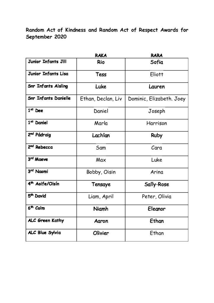 Random Act of Kindness and Random Act of Respect Awards for September (please see insert below)