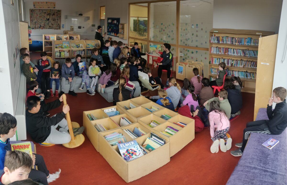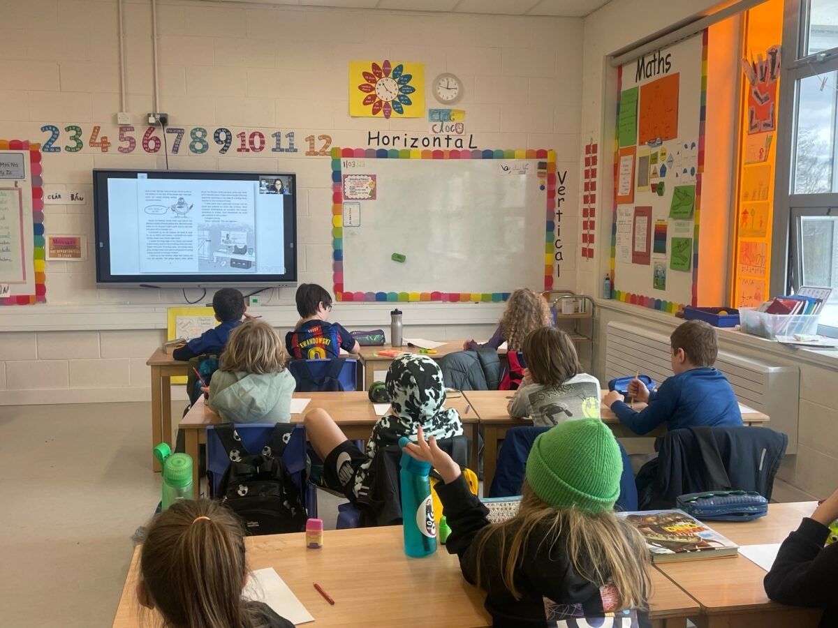 Lisa’s Senior Infants and Colm’s Fifth Class enjoyed a story as Gaeilge today at paired reading.
