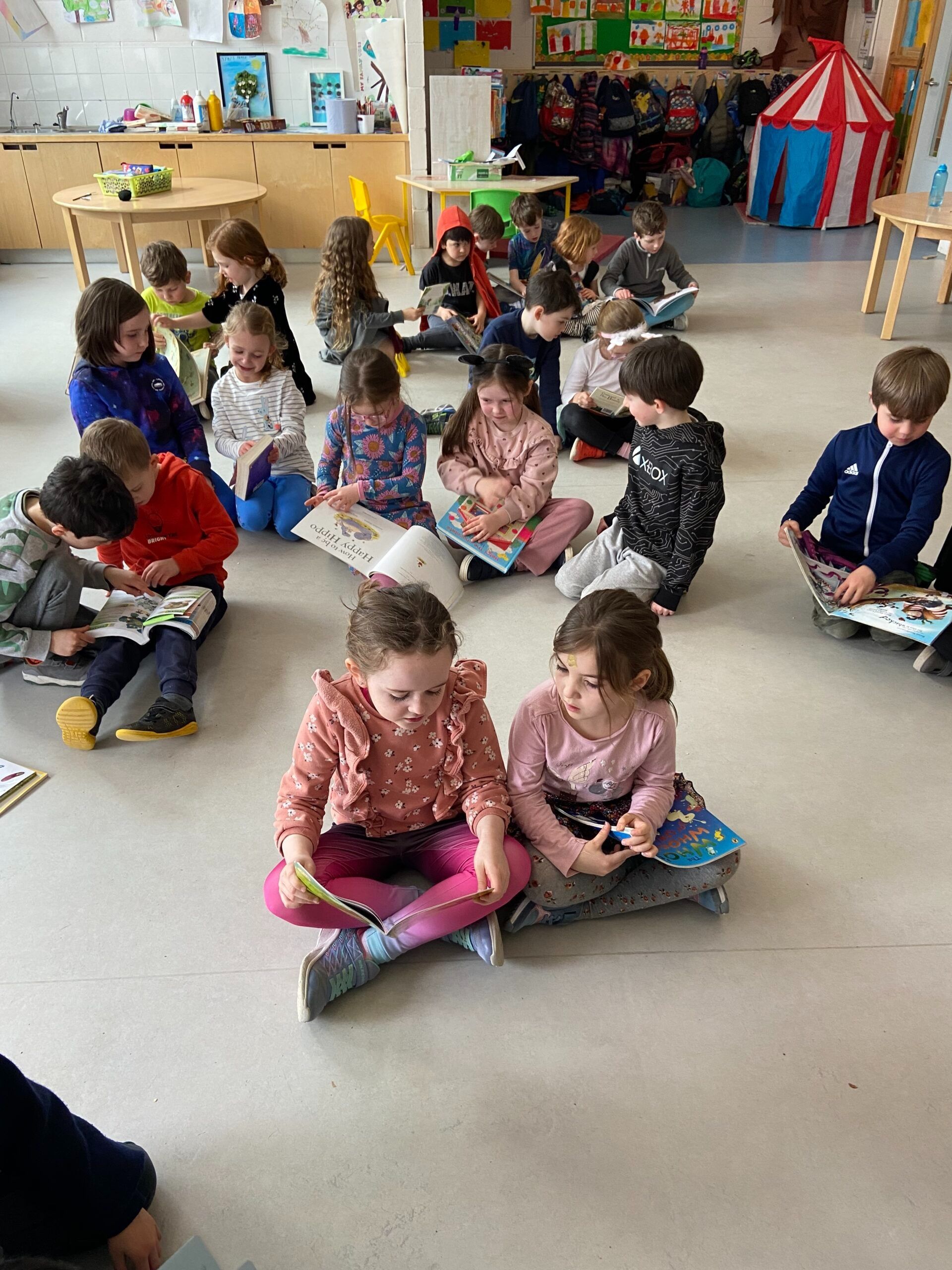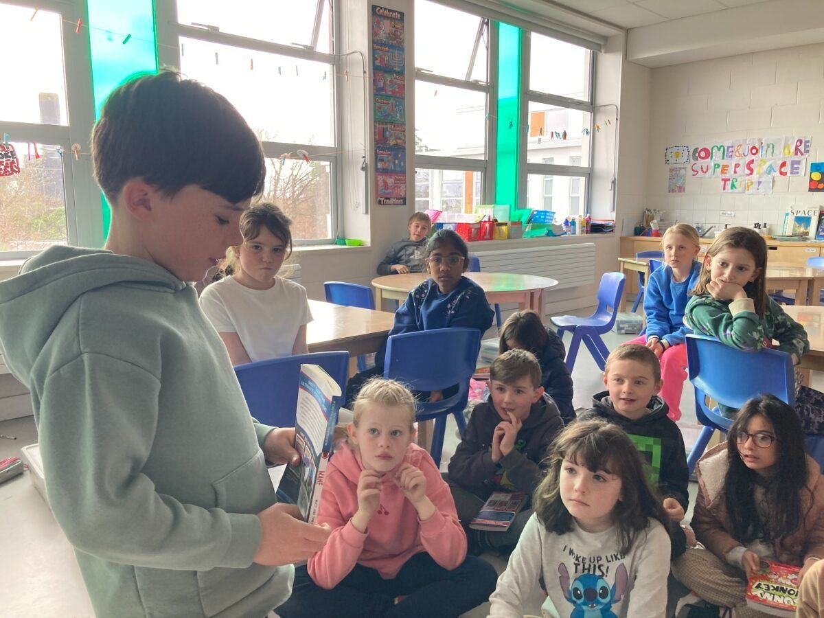 Niamh’s Senior Infants reading with 6th Class