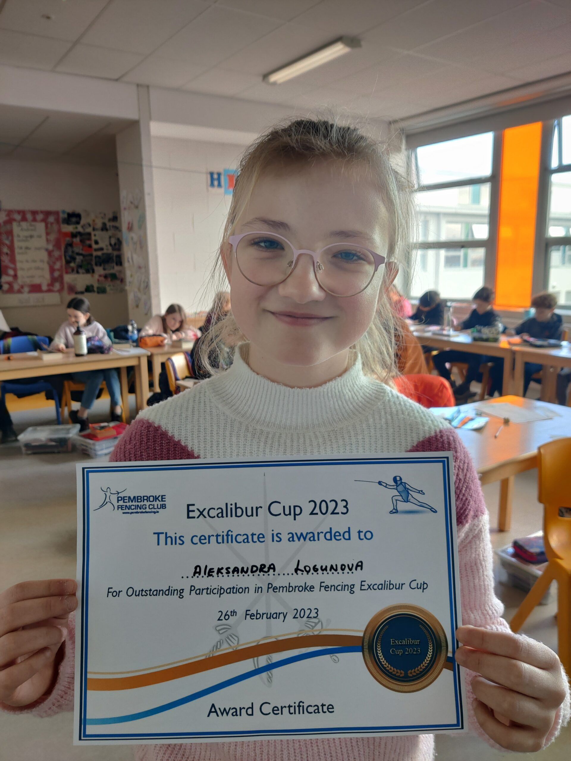 Sasha in 4th class has been teaching her class about her new hobby. She has taken up fencing! She even took part in a fencing competition last week. Keep it up Sasha! Maeve