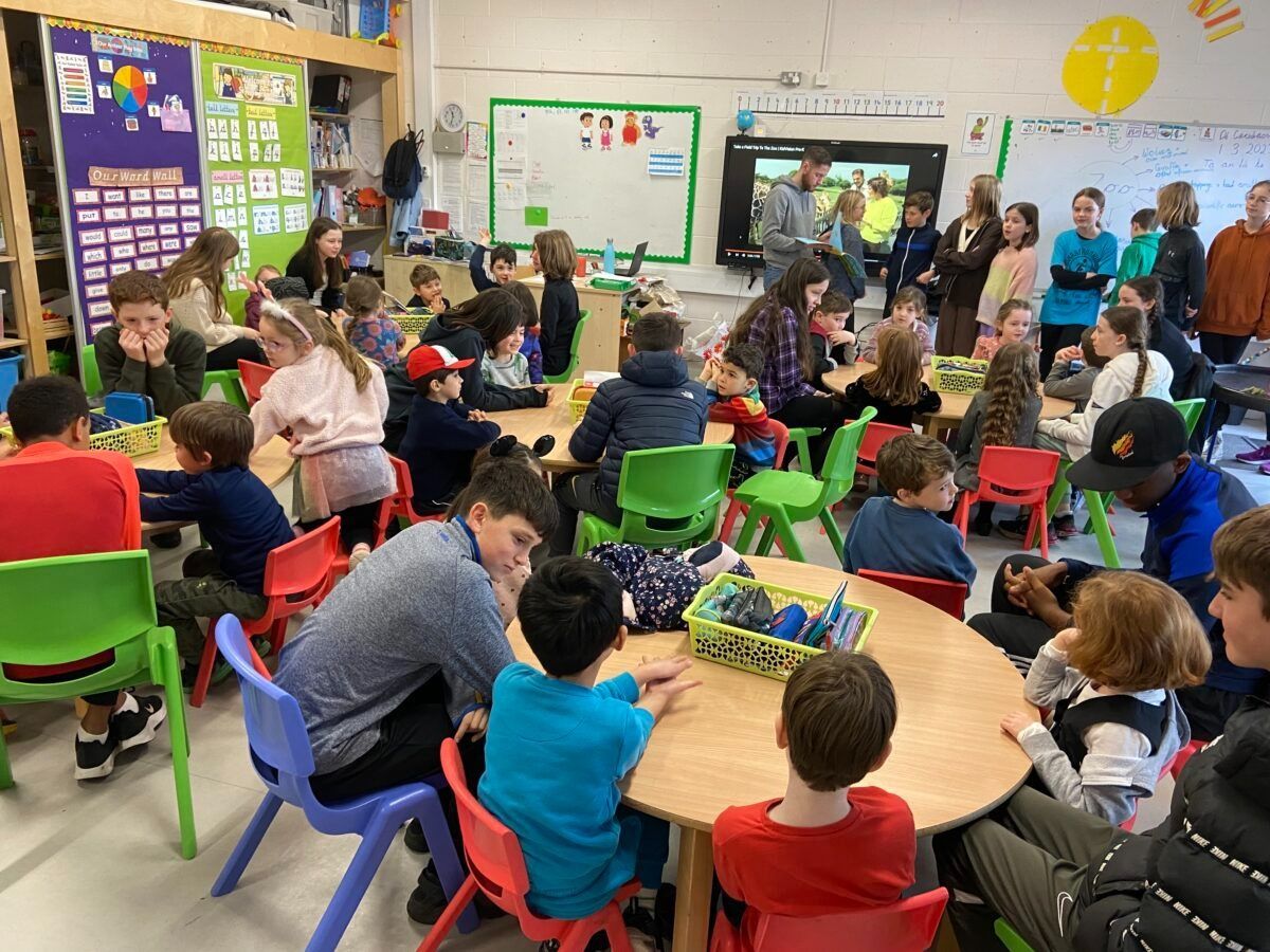 Ceannairí na Gaeilge ag caint le na páistí.