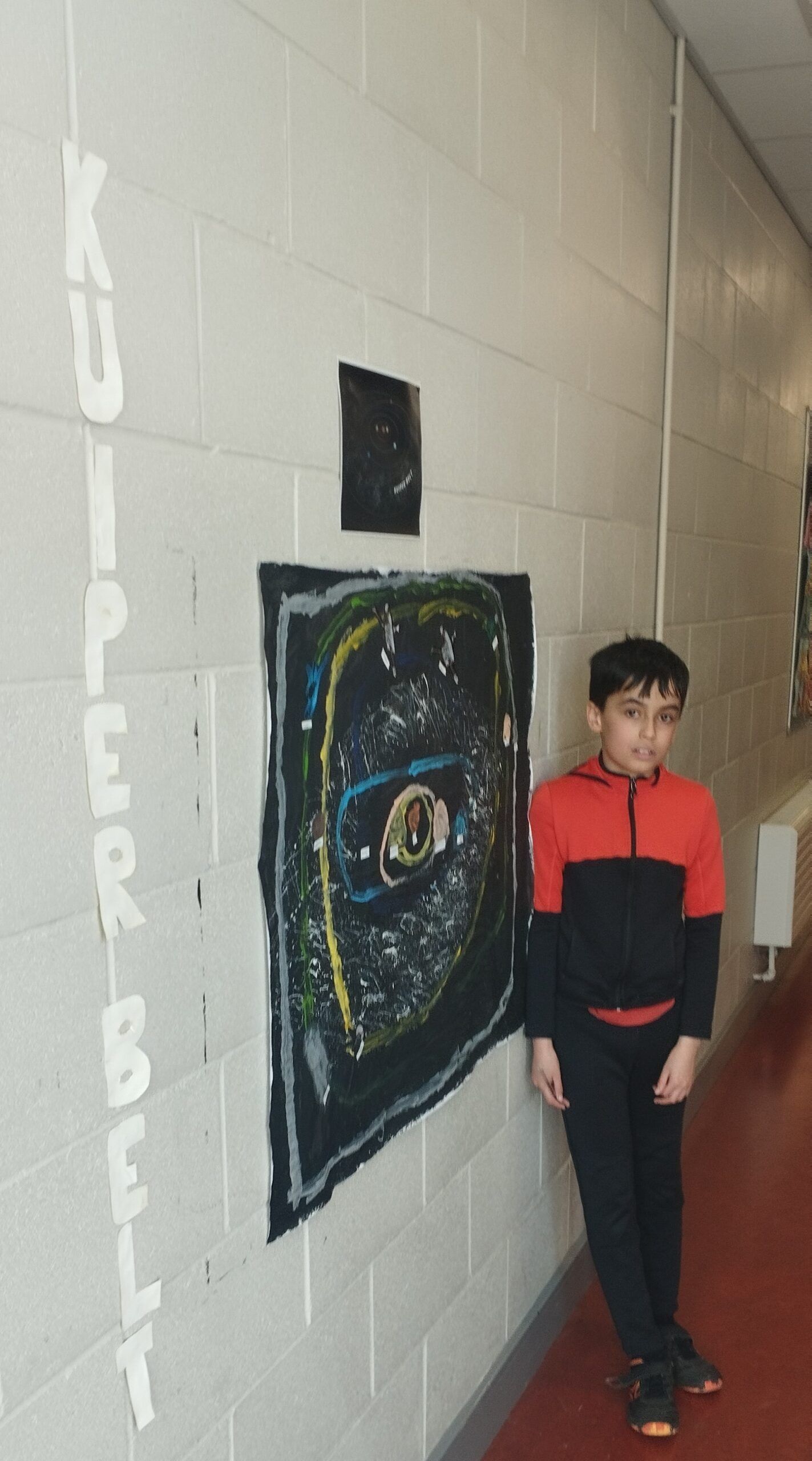 James from Beccy’s 5th class presenting his latest art project on the Kuiper Belt. The Kuiper Belt lies on the edge of the solar system, away from the warmth of the Sun, containing a vast ring of millions of ice bodies.