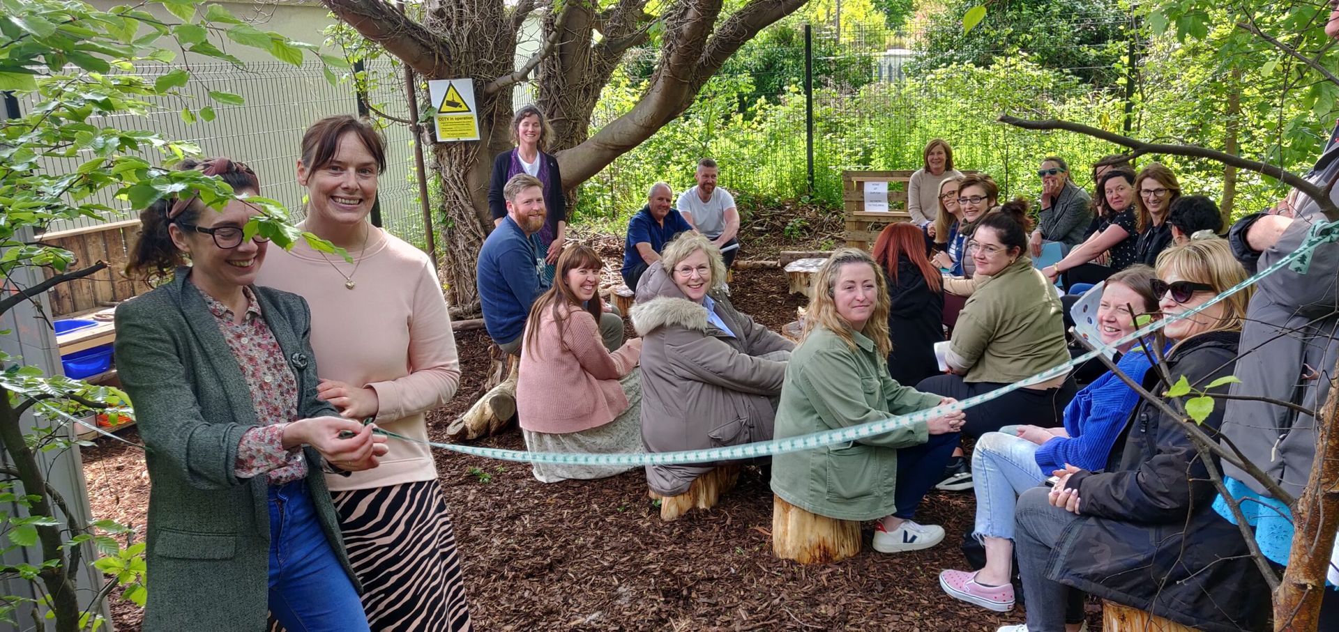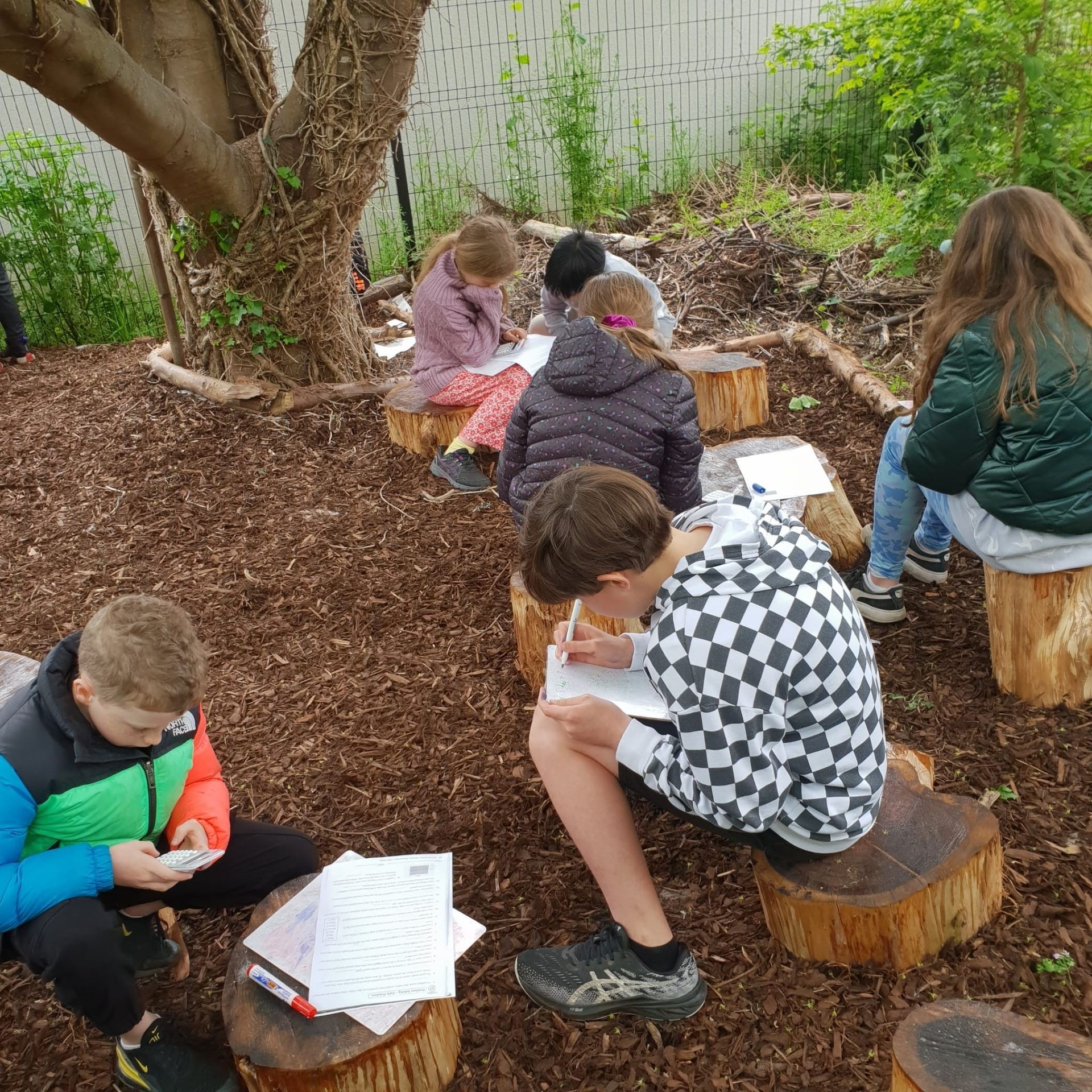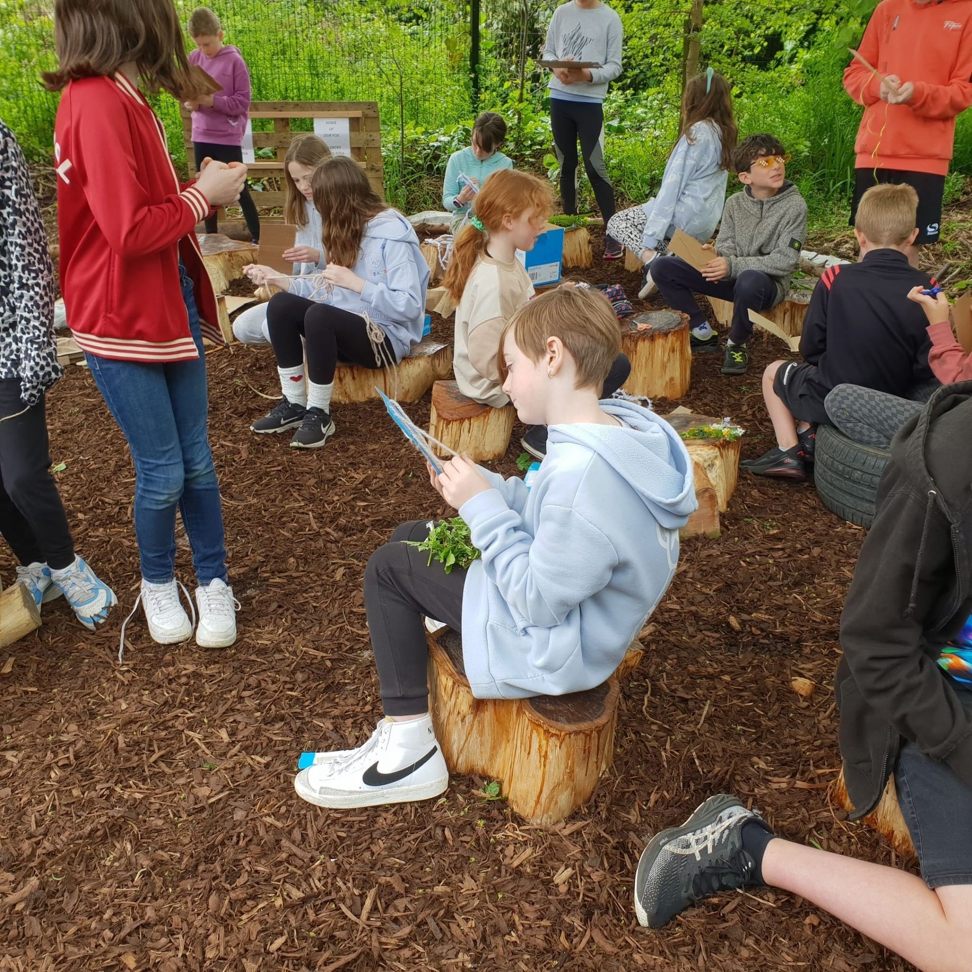 We are absolutely delighted to open our beautiful outdoor classroom set under a lovely sycamore tree, with bark surface, log seating, rustic kitchen and locker of resources. We are hugely grateful to Sorcha and Dee for their vision and follow through of this to creating such a grounding environment for children to enjoy learning. It wouldn’t have been made possible without Mick and his mighty energy and ability. Yesterday we had a simple opening to mark this, another milestone in making best use of our lovely school.