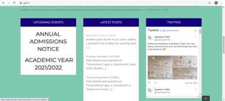 Twitter Account: We have a school Twitter account –@GlasnevinETNS which is updated regularly with photos from different classes. The feed is live on our website & can be found at the bottom of the homepage.