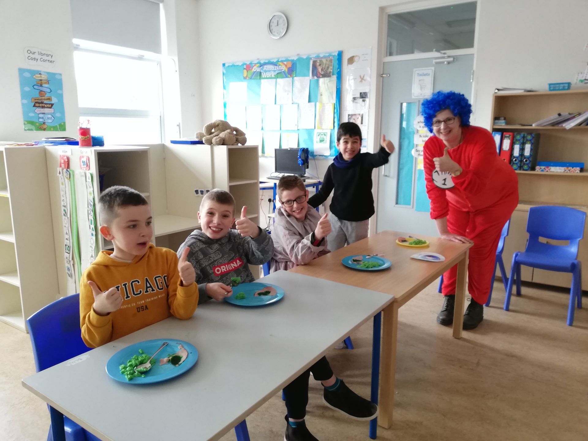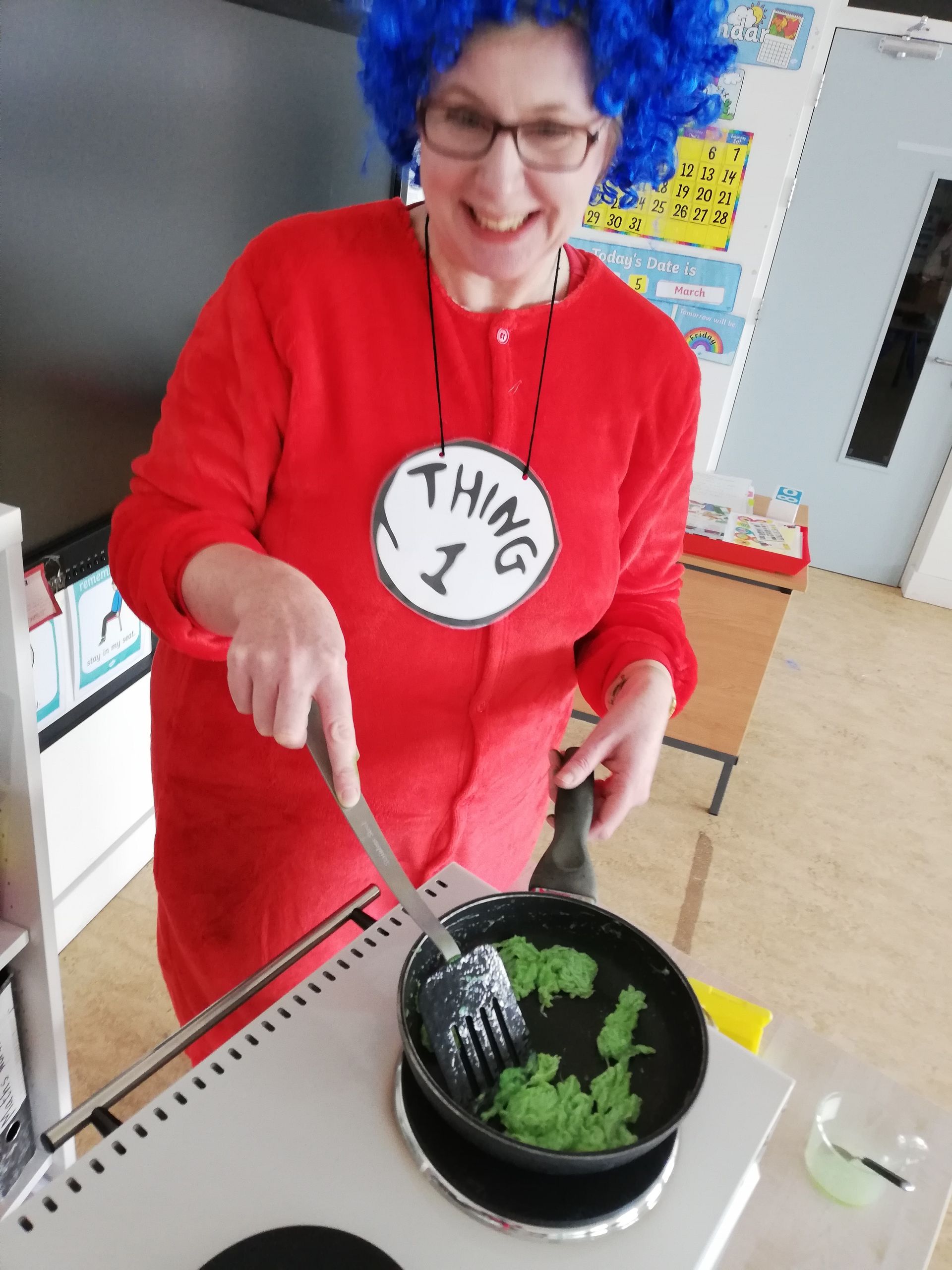 ALC blue have been reading ‘green eggs and ham’ by Dr Seuss. We wrote out the recipe and made delicious green eggs and ham for book day. We’re getting great at cracking eggs! Yummy.