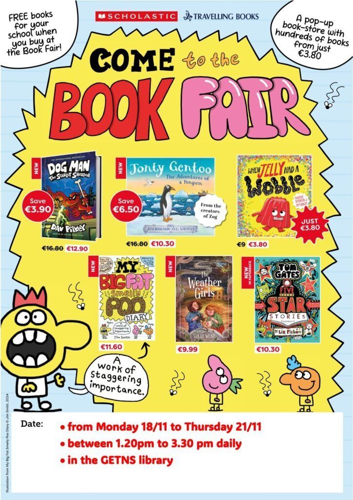 The Scholastic Book Fair will be held in the School Library from 1:30pm to 3:30pm from Monday 18th November to Thursday 21st November. For every €1 spent at the Book Fair, 60c will go towards books for the school library. Maybe take this opportunity to buy some presents for birthdays/Christmas. Revolut or cash will be accepted on the day. Watch out for some posters about the fair around the school.