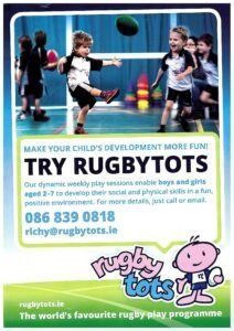 Please see below RugyTots starting on Sunday in the school hall. And Information about a Market happening in Glasnevin in December.
