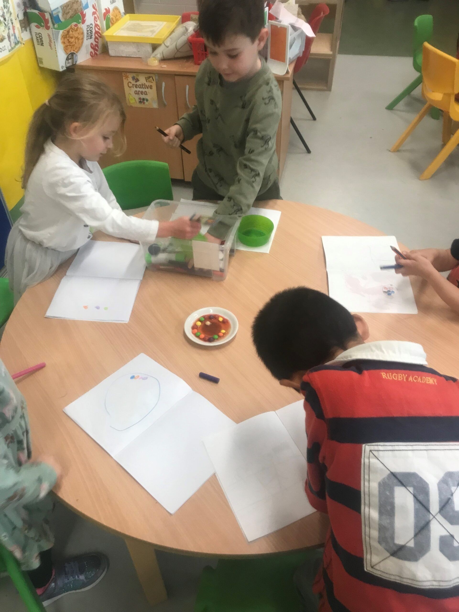 Junior infants explored how food colouring on sweets dissolves in warm water. We had great fun guessing what would happen and recording the results