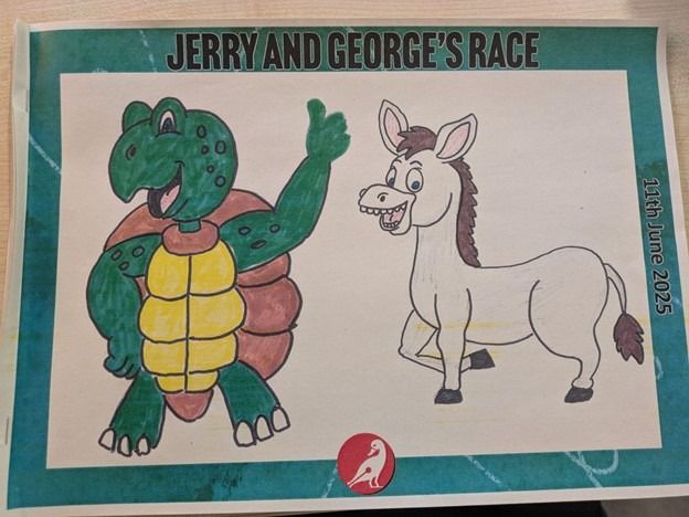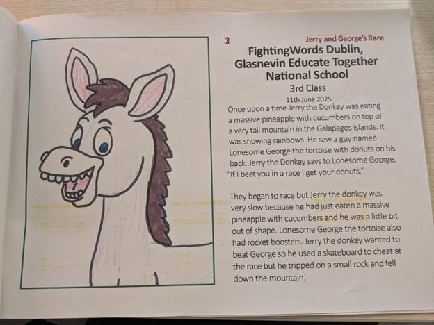 Third Class had great fun at the Fighting Words workshop yesterday. They worked together to publish a brilliant story called “Jerry and George’s Race”. Please read our story below! Liah