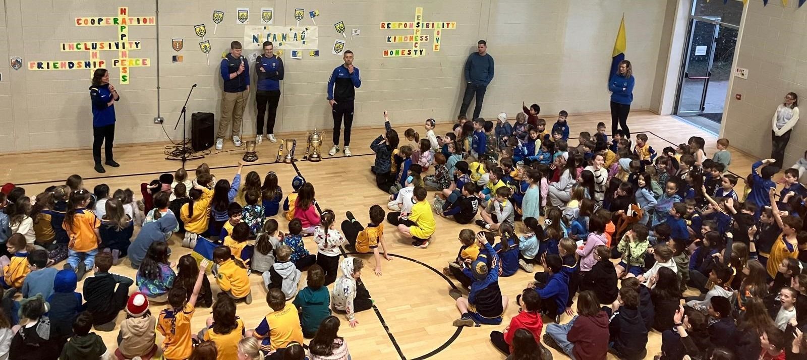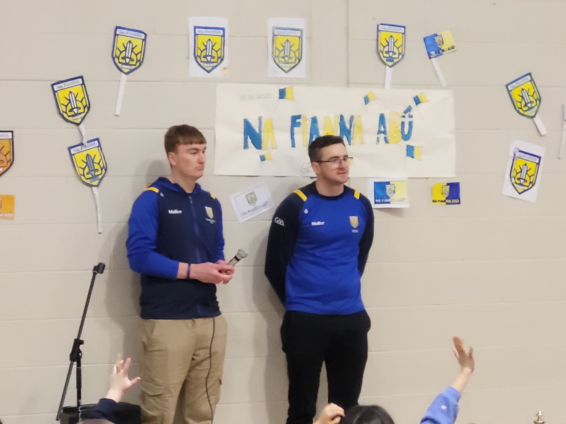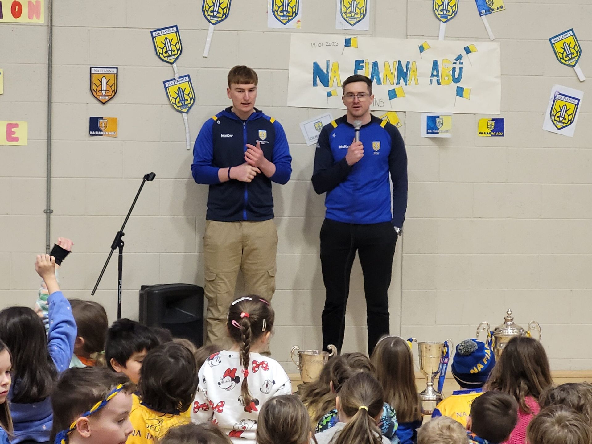 This morning some of the players and their families visited the school. They brought along their silverware from County, Leinster and All Ireland championships for all to see. The children gave them a very warm welcome and asked the players some very interesting questions. Na Fianna Abú