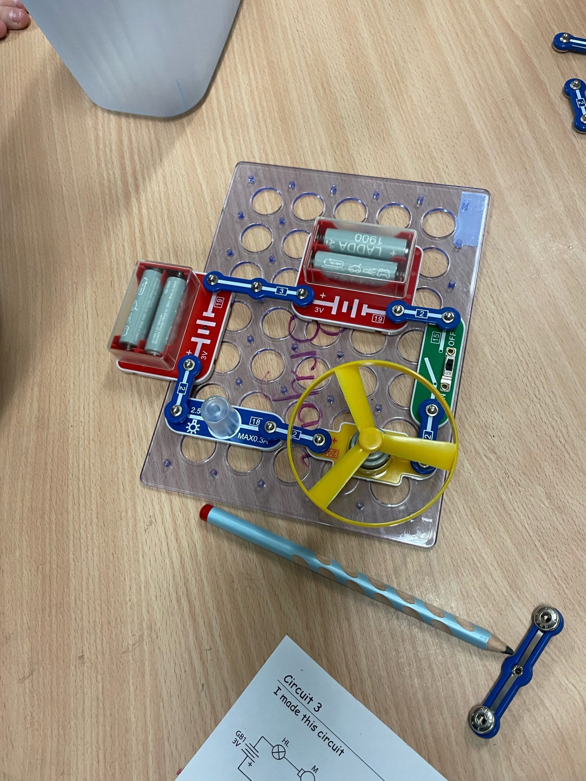 Daniel’s JI really enjoyed having Sylvia’s 5th class in to teach us all about circuits! We made a light switch and a propellor fly!
