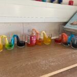 Our next experiment was the colour run test. We created secondary colours by mixing primary colours together. Using paper towels, the two colours moved from their original glasses and met in the middle to create green/orange/purple! This experiment took a lot of patience as the water moved very slowly.