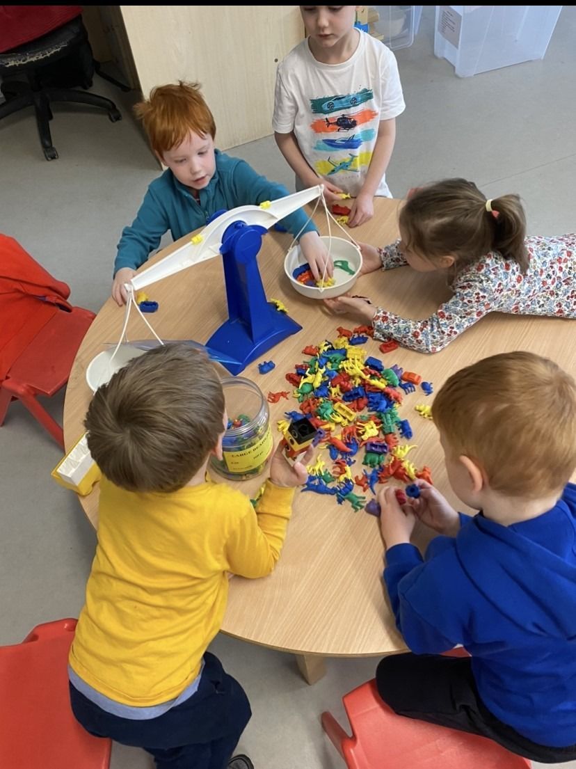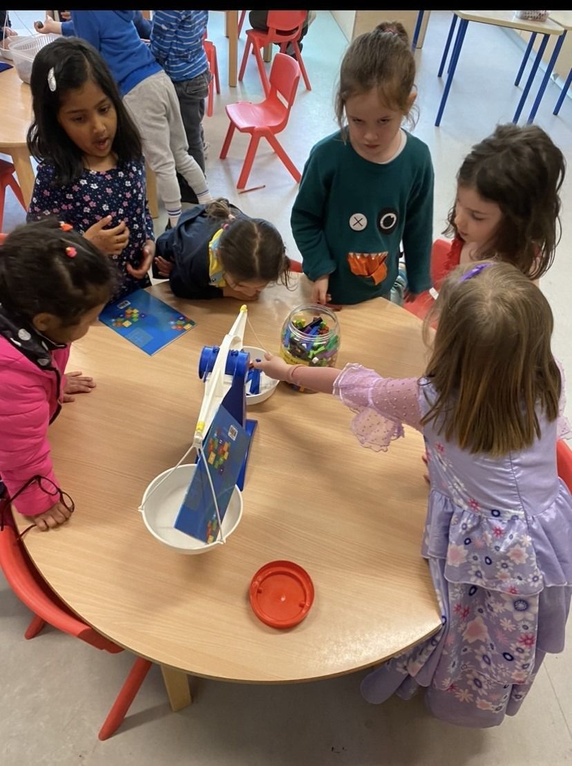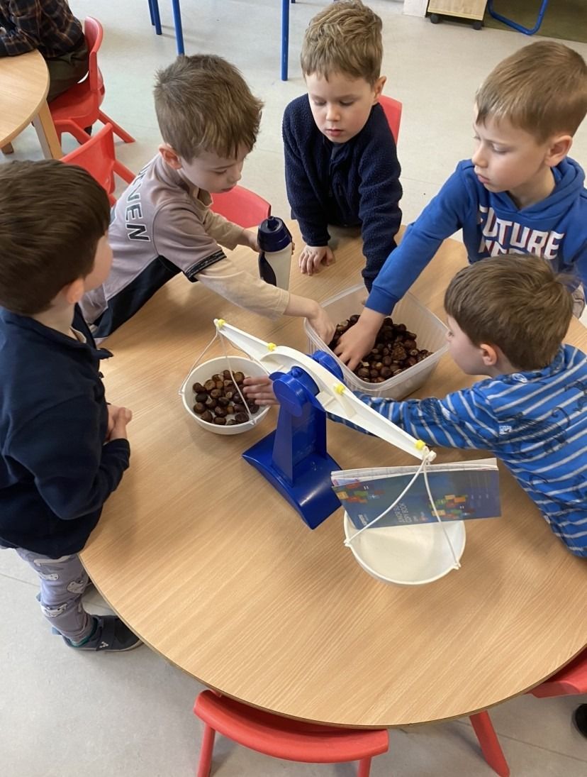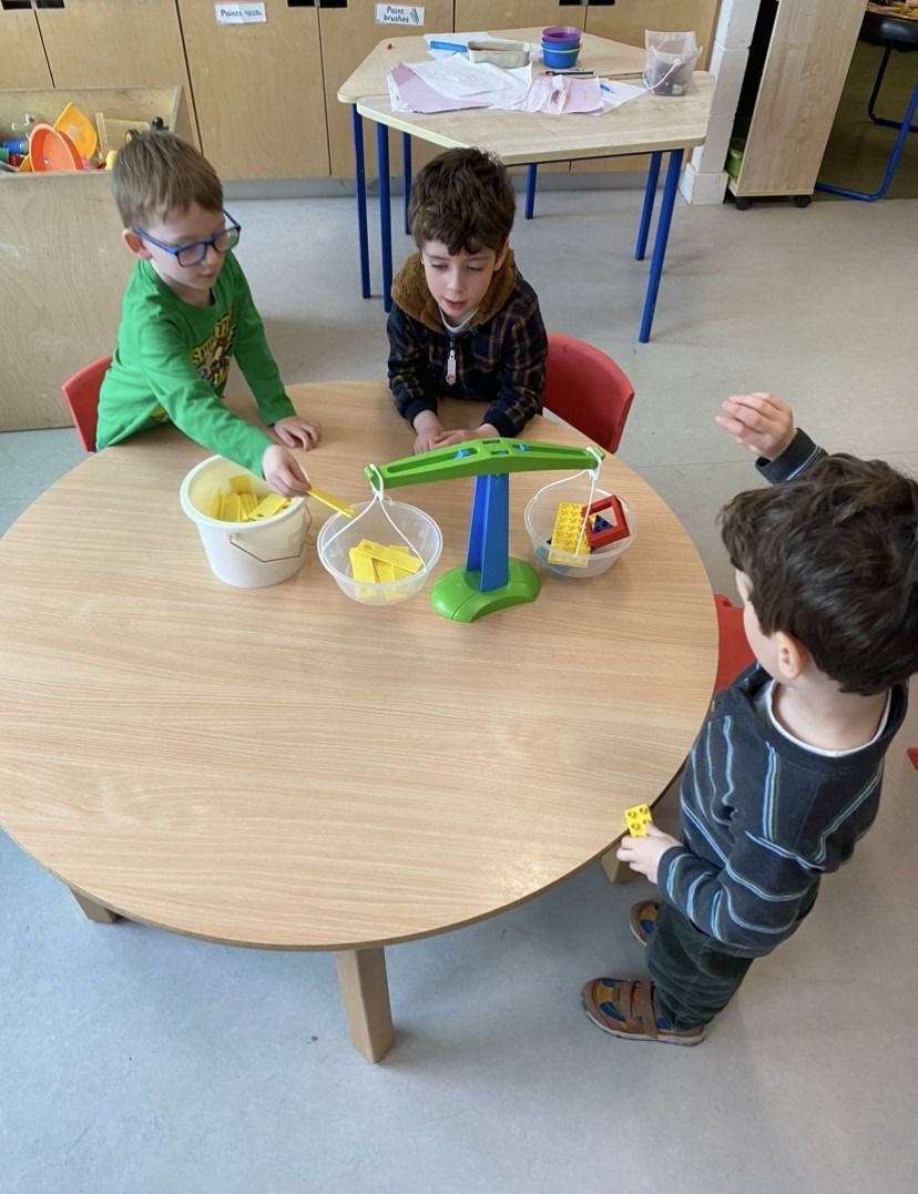 Daniel’s junior infants having great fun learning about weight by using scales and trying to balance them!