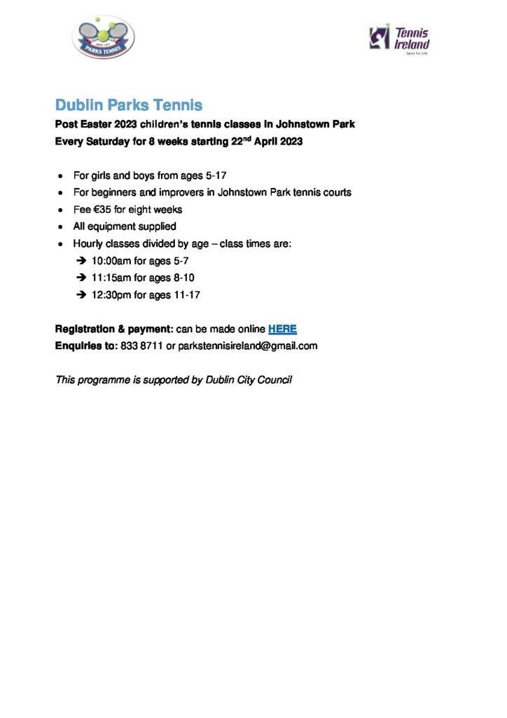 Parks Tennis still have some spaces in Johnstown Park for the post Easter programme, commencing this Saturday, 22nd April.