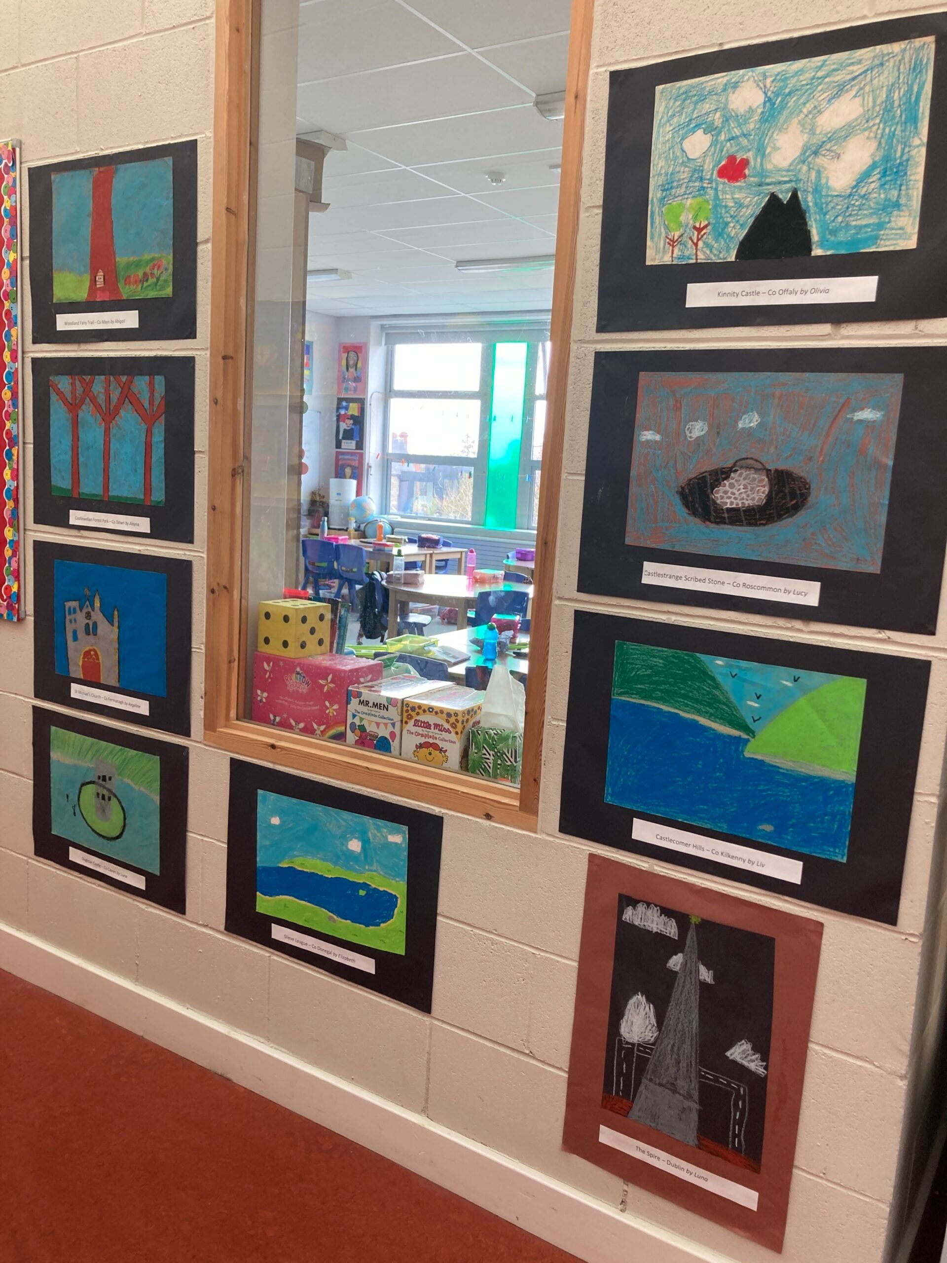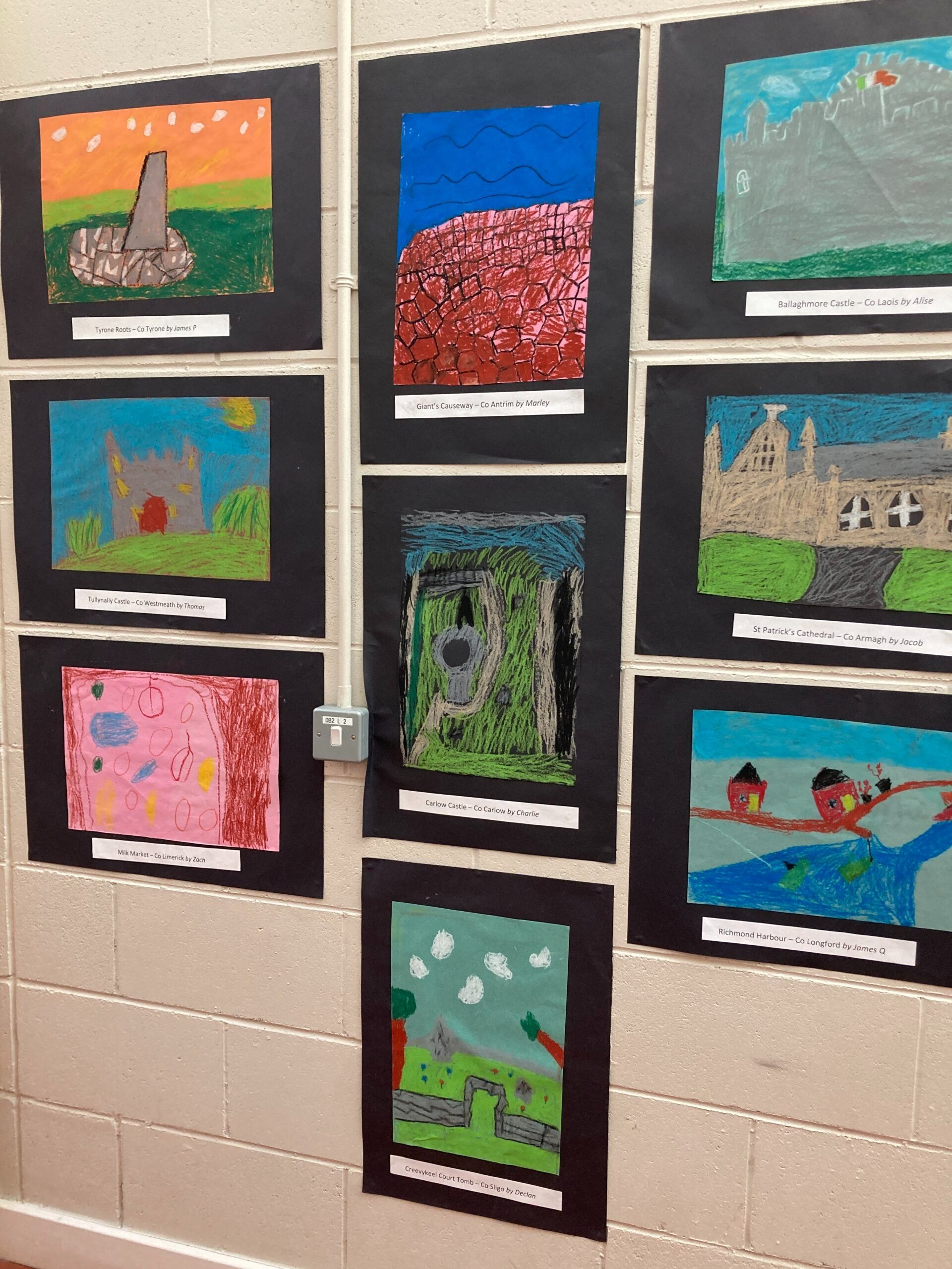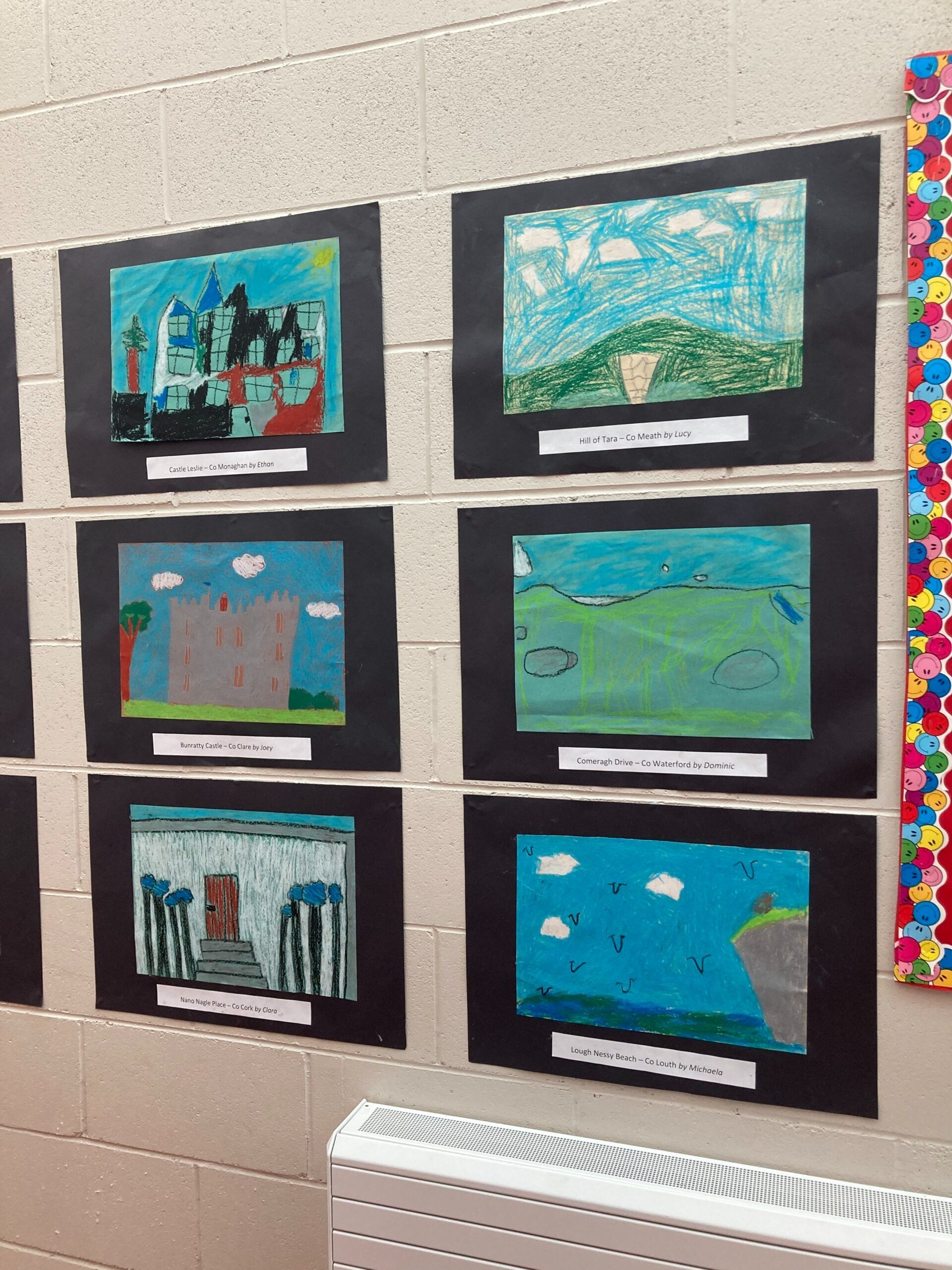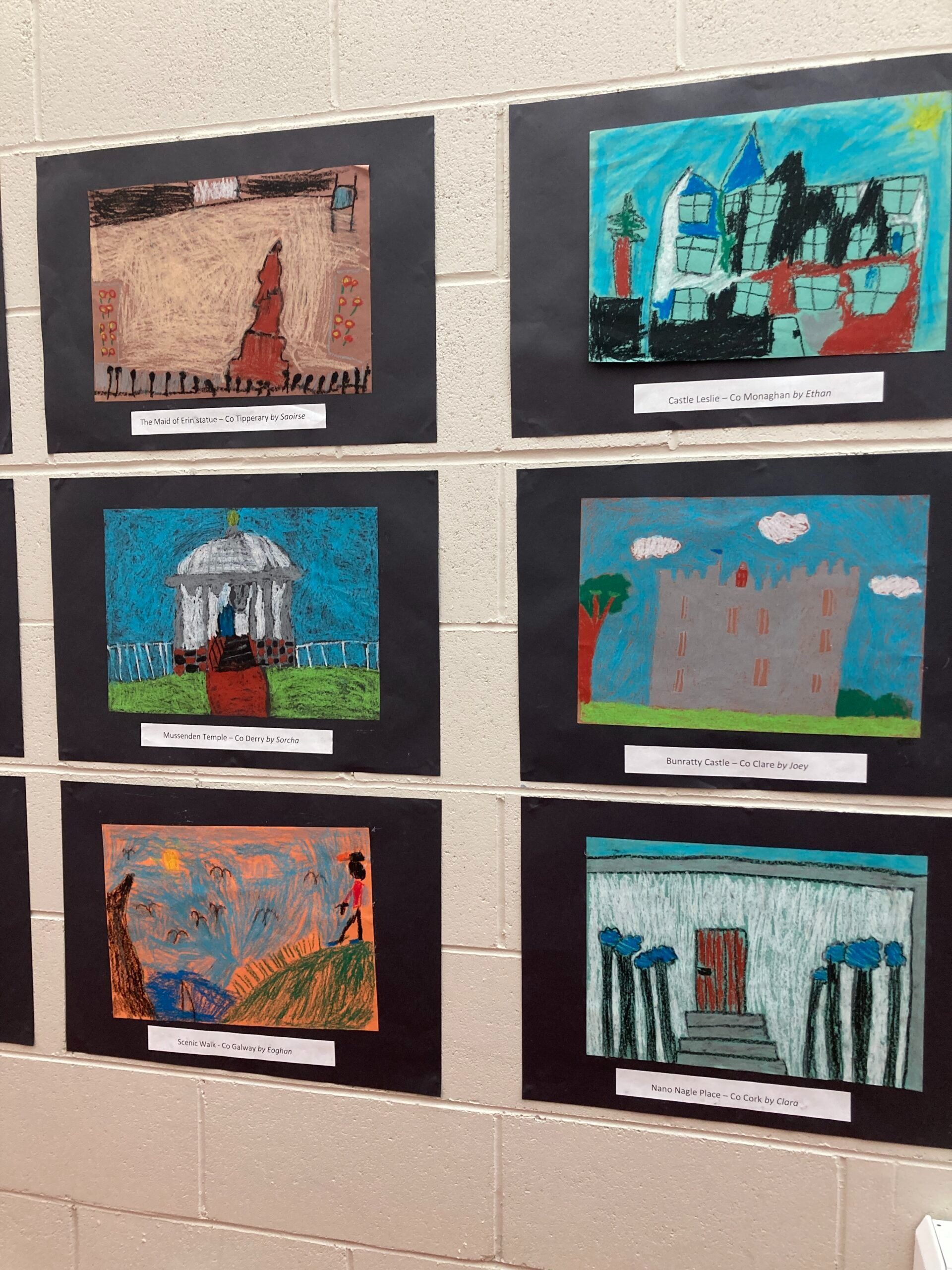 2nd class made postcards from around Ireland. They researched landmarks from different counties and then made pictures using pastels.