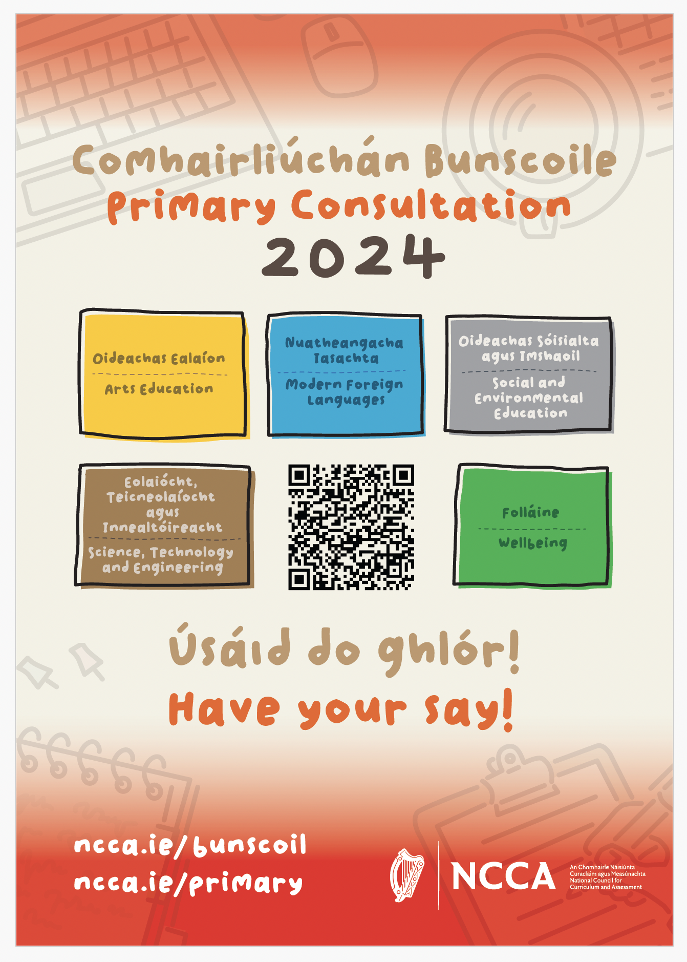 As you may be aware, the primary curriculum is changing. This is the most significant change to primary education in 25 years. The National Council for Curriculum and Assessment (NCCA) is holding a consultation on curriculum in the following areas: