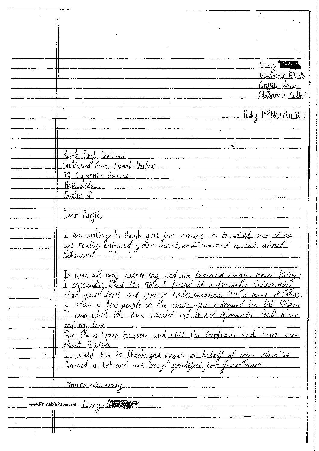 As part of their practice in formal letter writing the 6th class children wrote a letter thanking Ranjit for talking to their class about Sikhism last week. The letter chosen by the class to send to him was written by Lucy (see a copy of the letter across).