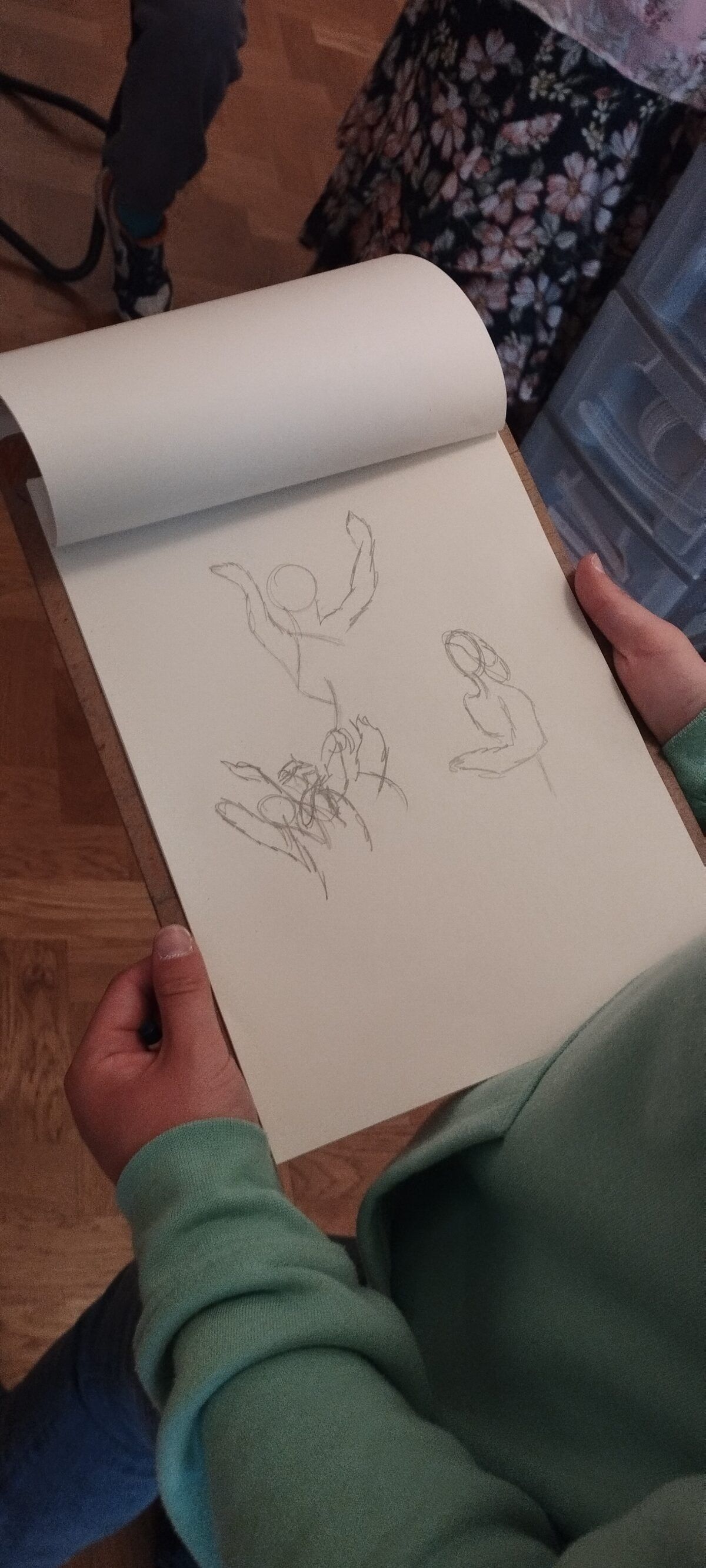 We also worked on drawing different characters from a painting called ‘The Wedding of Strongbow and Aoife’. During this particular drawing exercise, we would draw different characters in different ways: we drew characters in 30 seconds, 1 minute, 2 minutes, 3 minutes and then drawing without looking at the page. It was an interesting exercise that got us all thinking about the way that professional artists would draw.