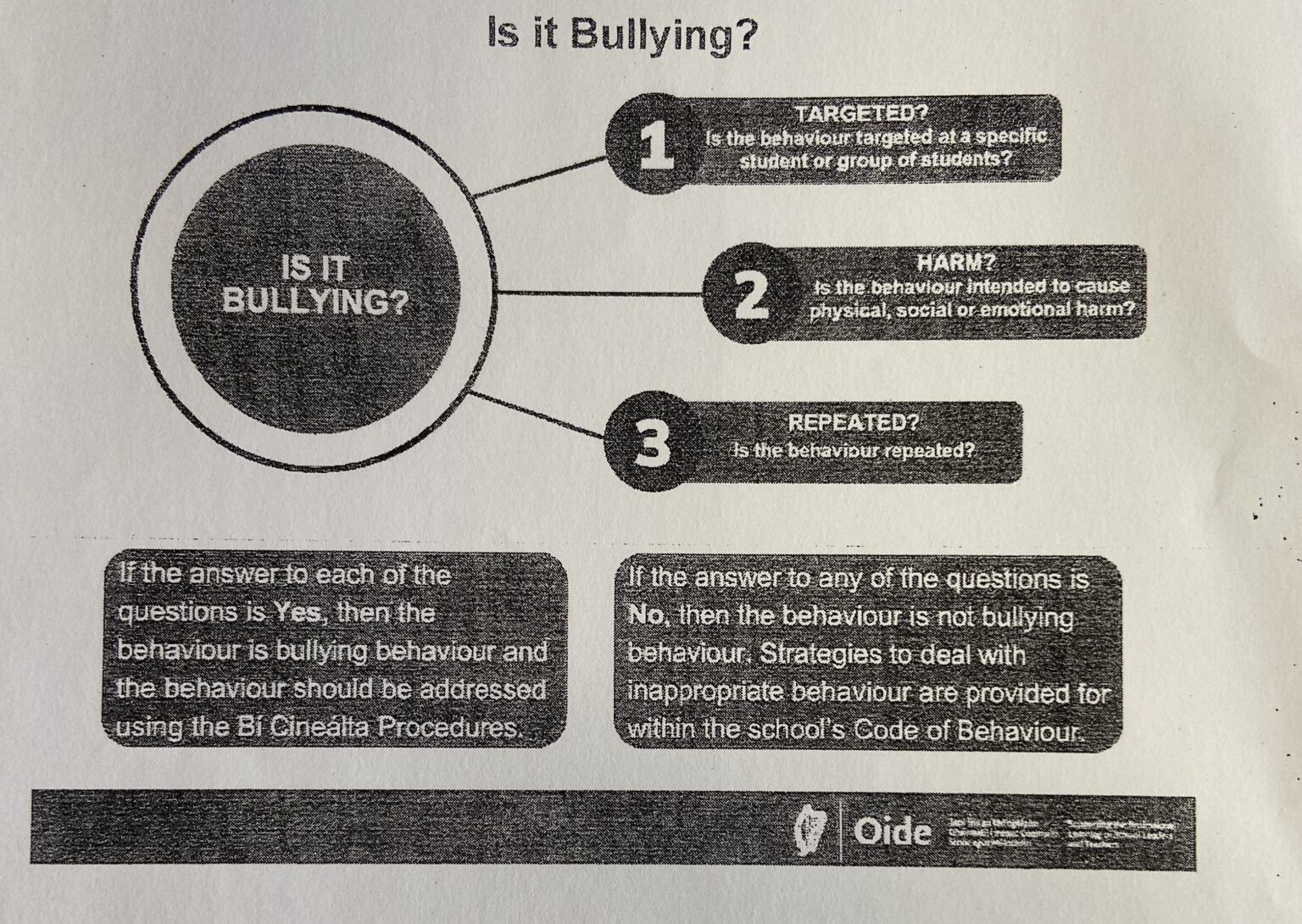 Student Council are continuing to meet regularly to develop a kid friendly Bí Cineálta policy. They have come up with a definition of bullying behaviour… ‘Bullying behaviour is hurting someone on the inside or the outside with your words or your actions, on purpose, over and over again. This can be offline or online.’