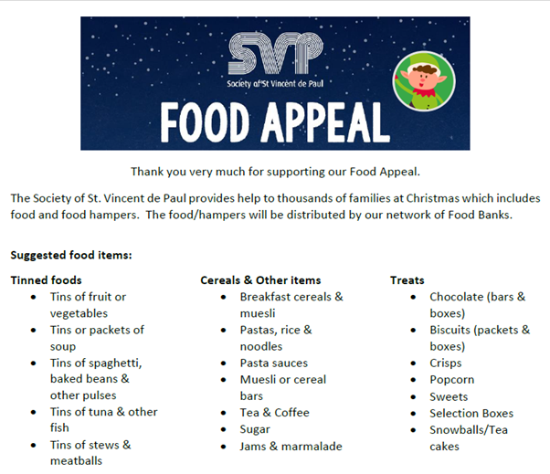 It is that time of year again when we like to support those who are not as fortunate as we are by collecting food hampers for St Vincent de Paul. Please drop any donations to the school (see examples below) between now and Thursday, next week, 7th December. St. Vincent de Paul will collect the hampers on Thursday morning.